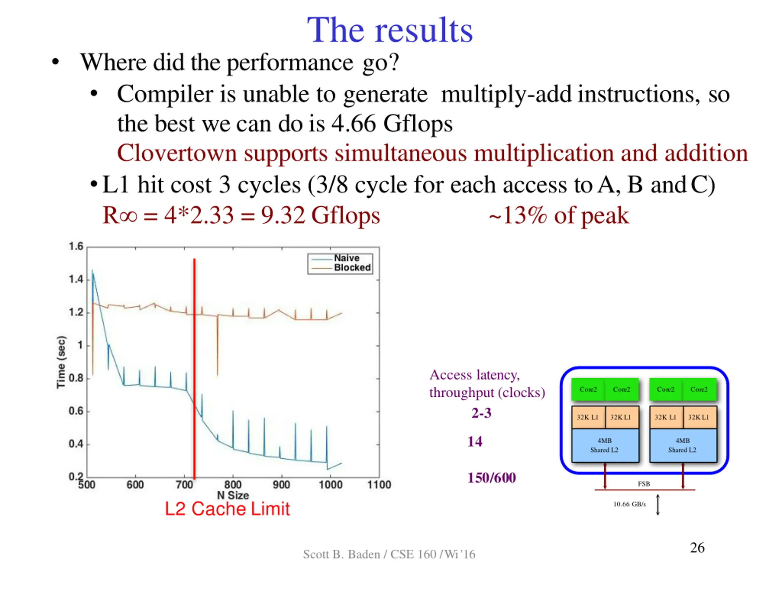 The results Where did the performance go? Compiler is unable to generate multiply-addinstructions, so the best we can do is 4.66 Gflops Clovertown supports simultaneous multiplication and addition L1 hit cost 3 cycles (3/8 cycle for each access to A, B andC) R = 4*2.33 = 9.32 Gflops ~13% of peak Access latency, throughput (clocks) 2-3 Core2 Core2 Core2 Core2 32K L1 32K L1 32K L1 32K L1 14 4MB 4MB Shared L2 Shared L2 150/600 FSB L2 Cache Limit 10.66 GB/s 26 Scott B. Baden / CSE 160 /Wi '16
