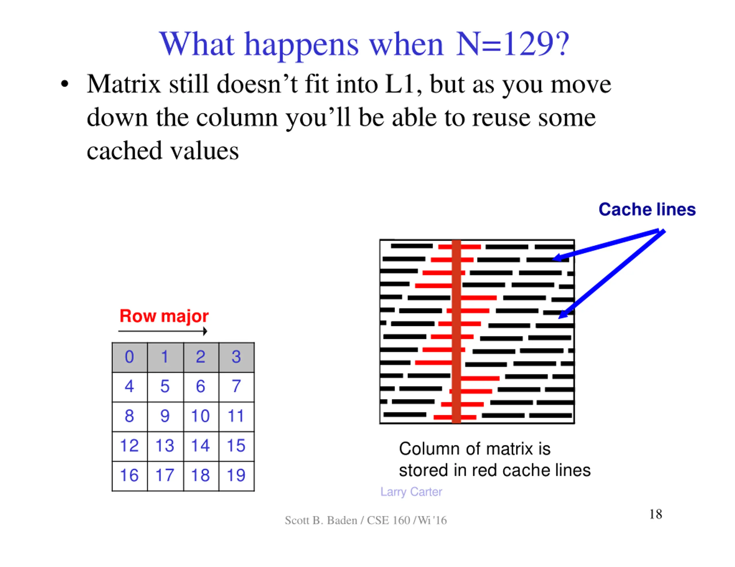 What happens when N=129? Matrix still doesn t fit into L1, but as you move down the column you ll be able to reuse some cached values Cache lines Row major 0 1 2 3 4 5 6 7 8 9 10 11 12 13 14 15 Column of matrix is stored in red cache lines Larry Carter 16 17 18 19 18 Scott B. Baden / CSE 160 /Wi '16