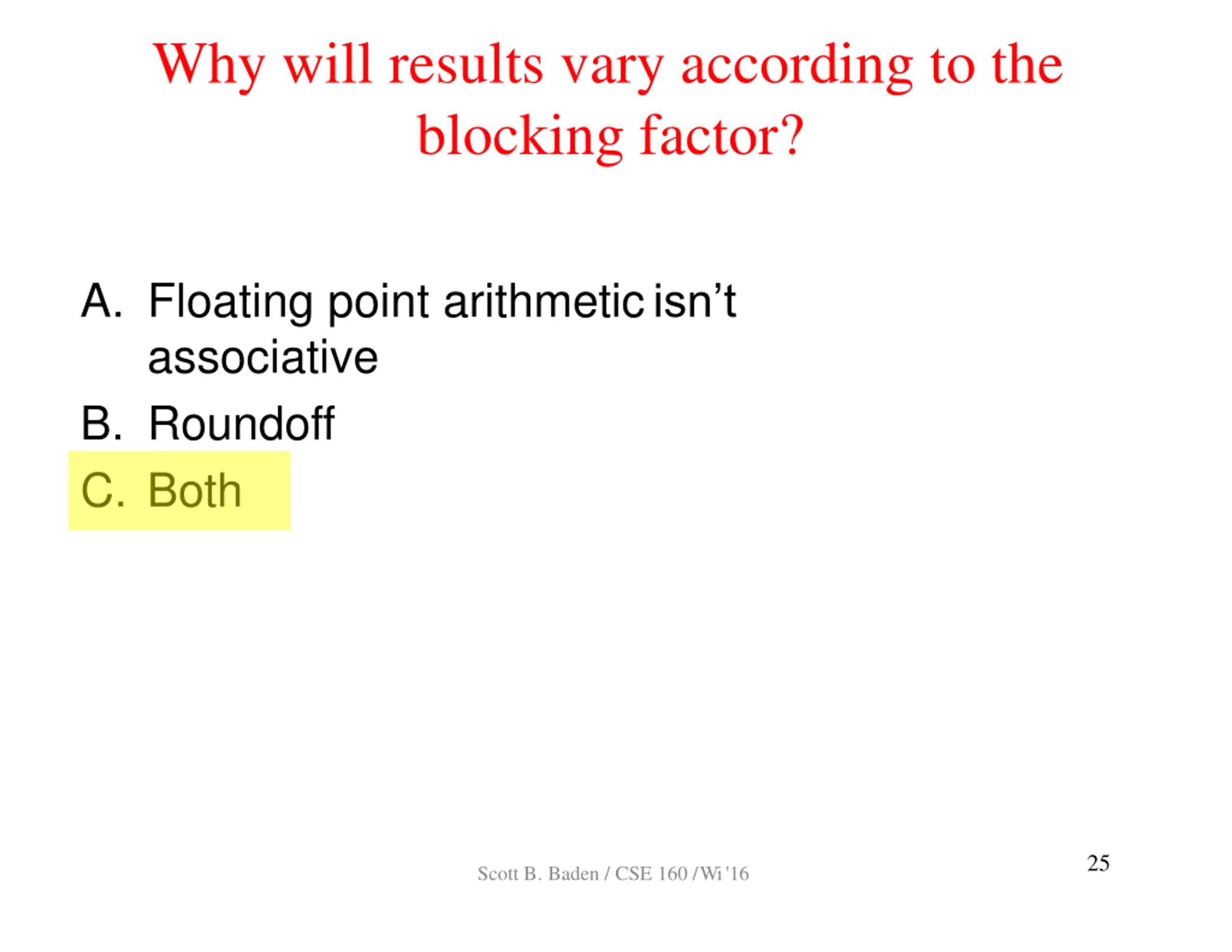 Why will results vary according to the blocking factor? A. Floating point arithmeticisn t associative B. Roundoff C. Both 25 Scott B. Baden / CSE 160 /Wi '16