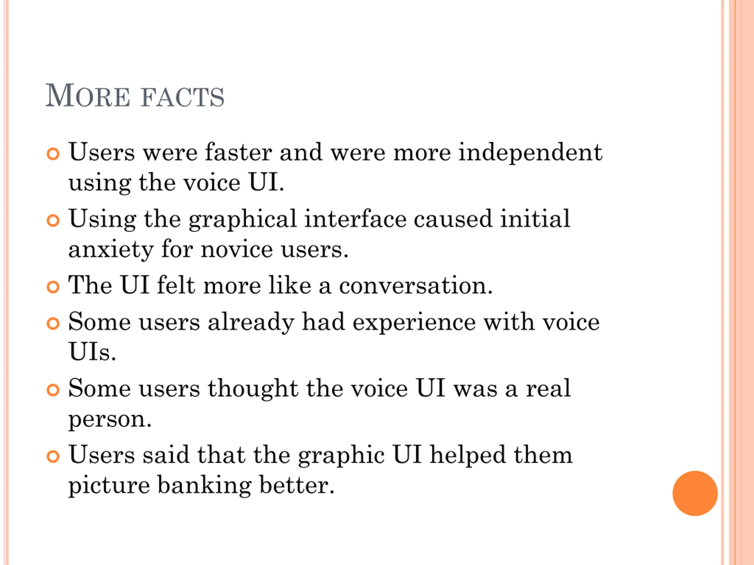 MORE FACTS Users were faster and were more independent using the voice UI. Using the graphical interface caused initial anxiety for novice users. The UI felt more like a conversation. Some users already had experience with voice UIs. Some users thought the voice UI was a real person. Users said that the graphic UI helped them picture banking better.