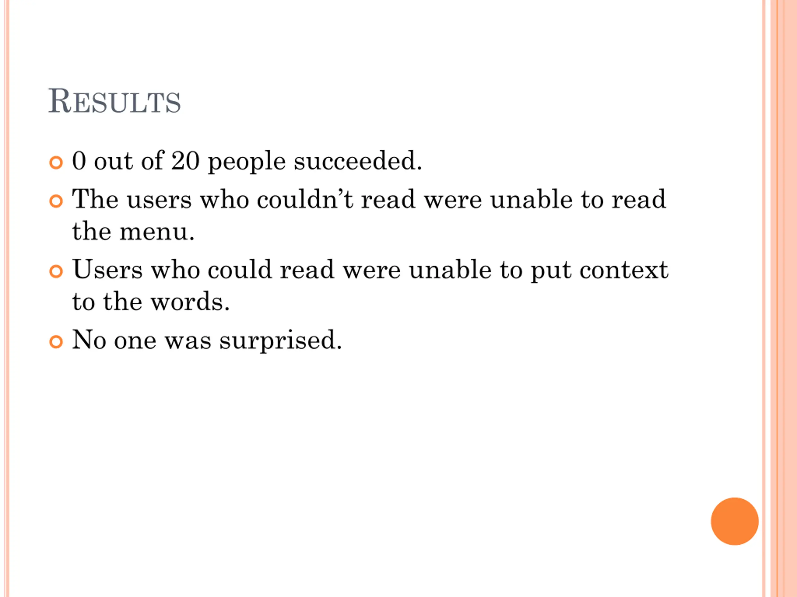 RESULTS 0 out of 20 people succeeded. The users who couldn t read were unable to read the menu. Users who could read were unable to put context to the words. No one was surprised.