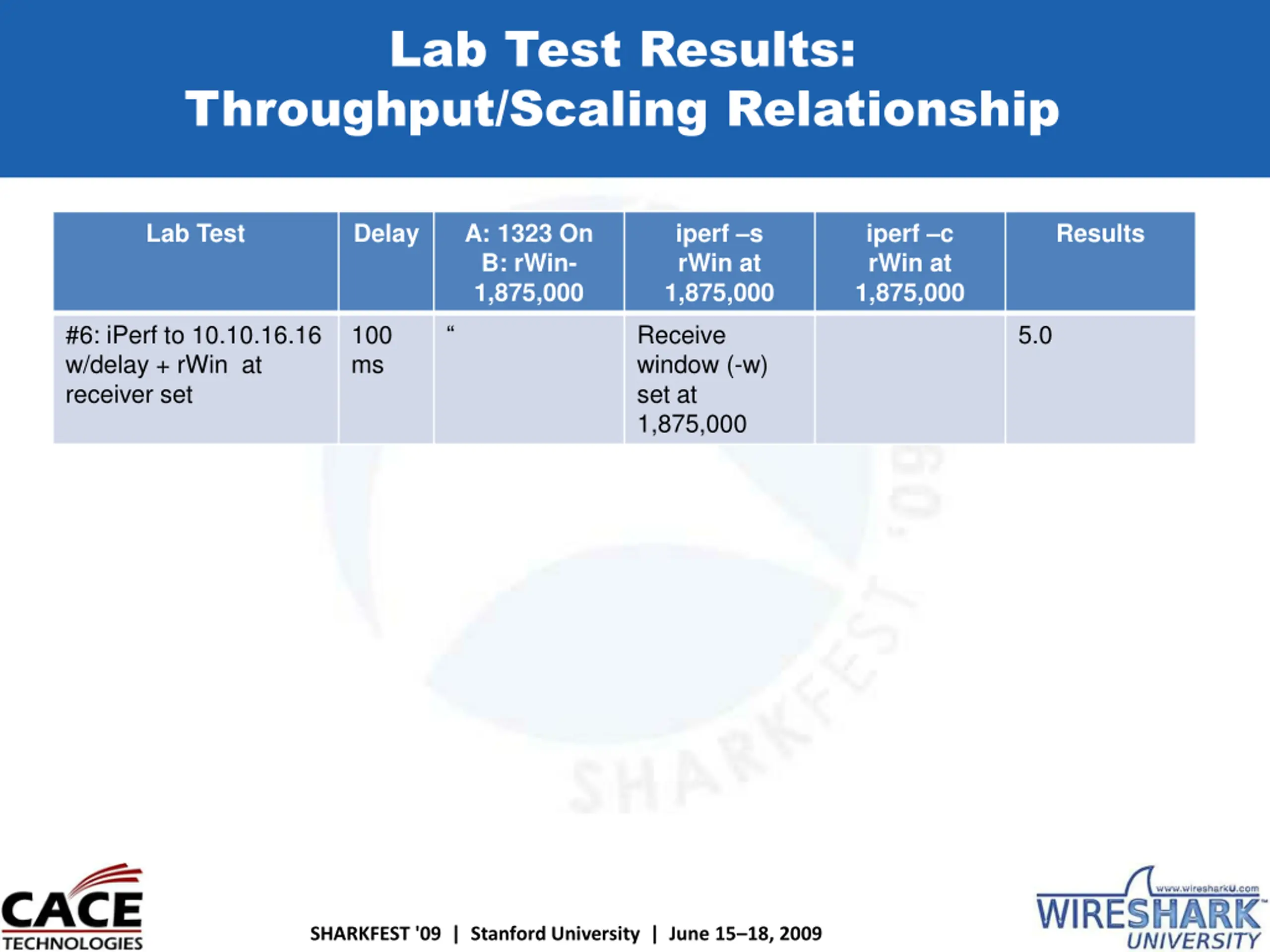 Lab Test Results: Throughput/Scaling Relationship Lab Test Delay A: 1323 On B: rWin- 1,875,000 iperf s rWin at 1,875,000 iperf c rWin at 1,875,000 Results #6: iPerf to 10.10.16.16 w/delay + rWin at receiver set 100 ms Receive window (-w) set at 1,875,000 5.0 SHARKFEST '09 | Stanford University | June 15 18, 2009