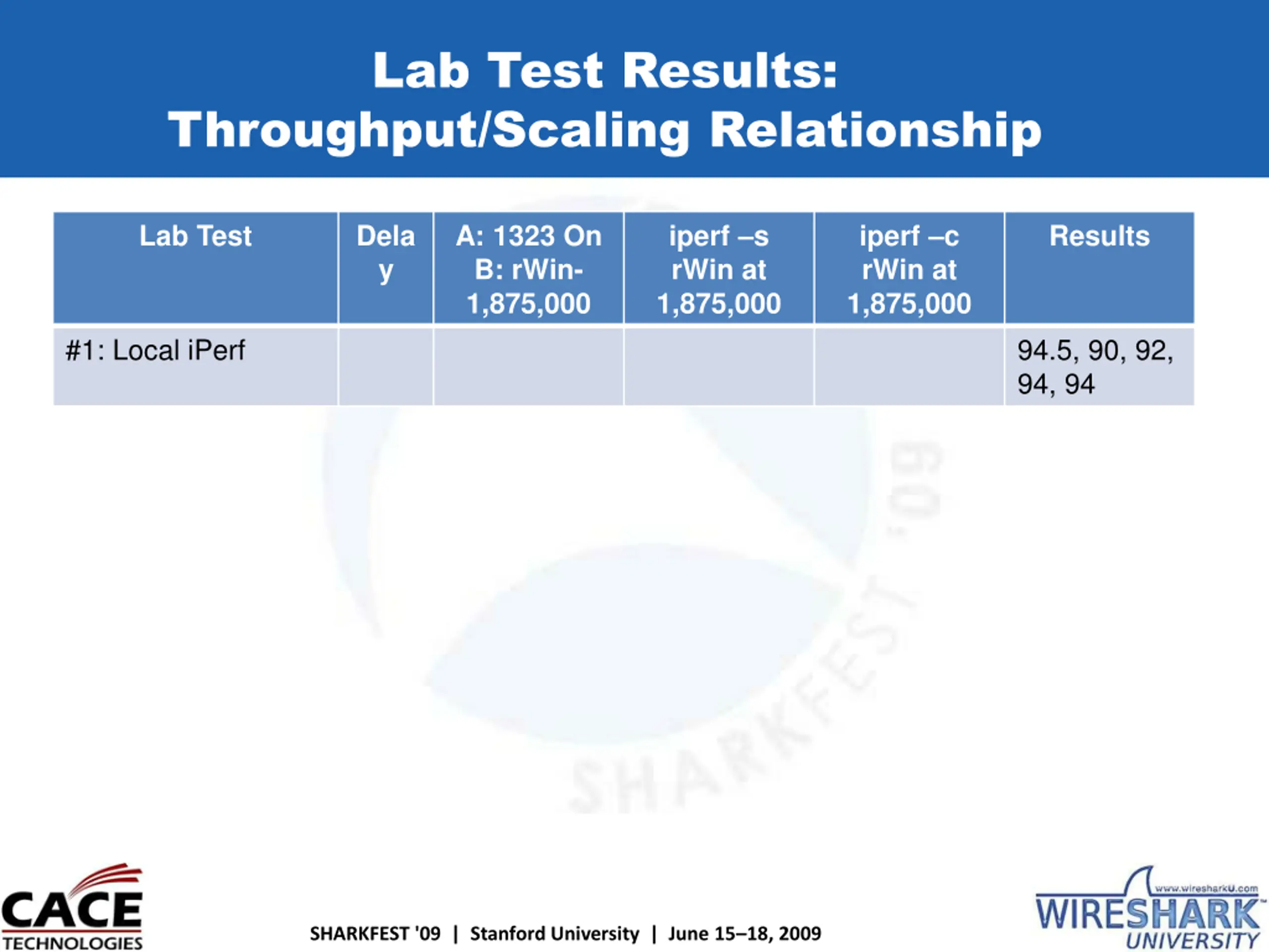 Lab Test Results: Throughput/Scaling Relationship Lab Test Dela y A: 1323 On B: rWin- 1,875,000 iperf s rWin at 1,875,000 iperf c rWin at 1,875,000 Results #1: Local iPerf 94.5, 90, 92, 94, 94 SHARKFEST '09 | Stanford University | June 15 18, 2009
