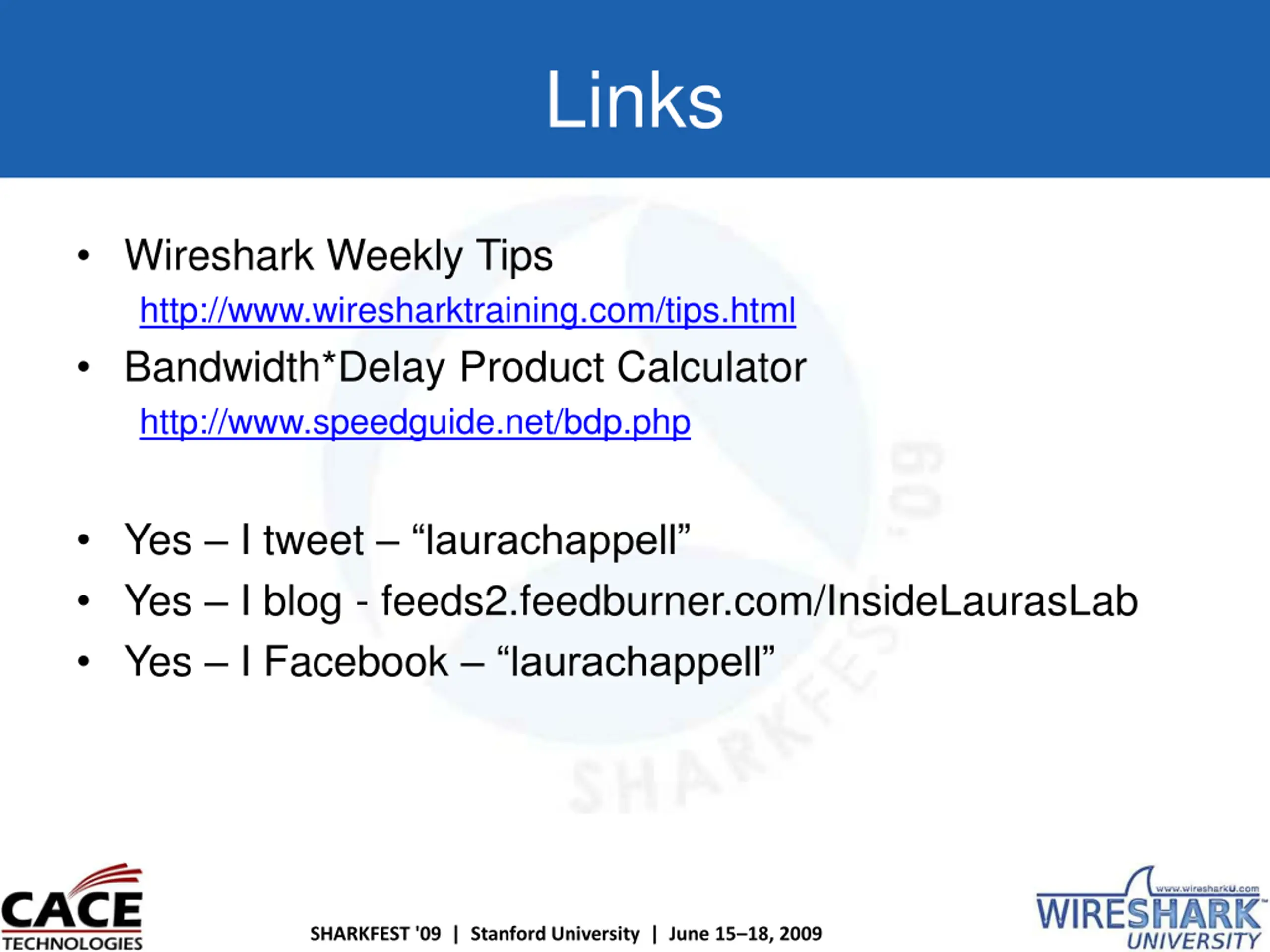 Links Wireshark Weekly Tips http://www.wiresharktraining.com/tips.html Bandwidth*Delay Product Calculator http://www.speedguide.net/bdp.php Yes I tweet laurachappell Yes I blog - feeds2.feedburner.com/InsideLaurasLab Yes I Facebook laurachappell SHARKFEST '09 | Stanford University | June 15 18, 2009