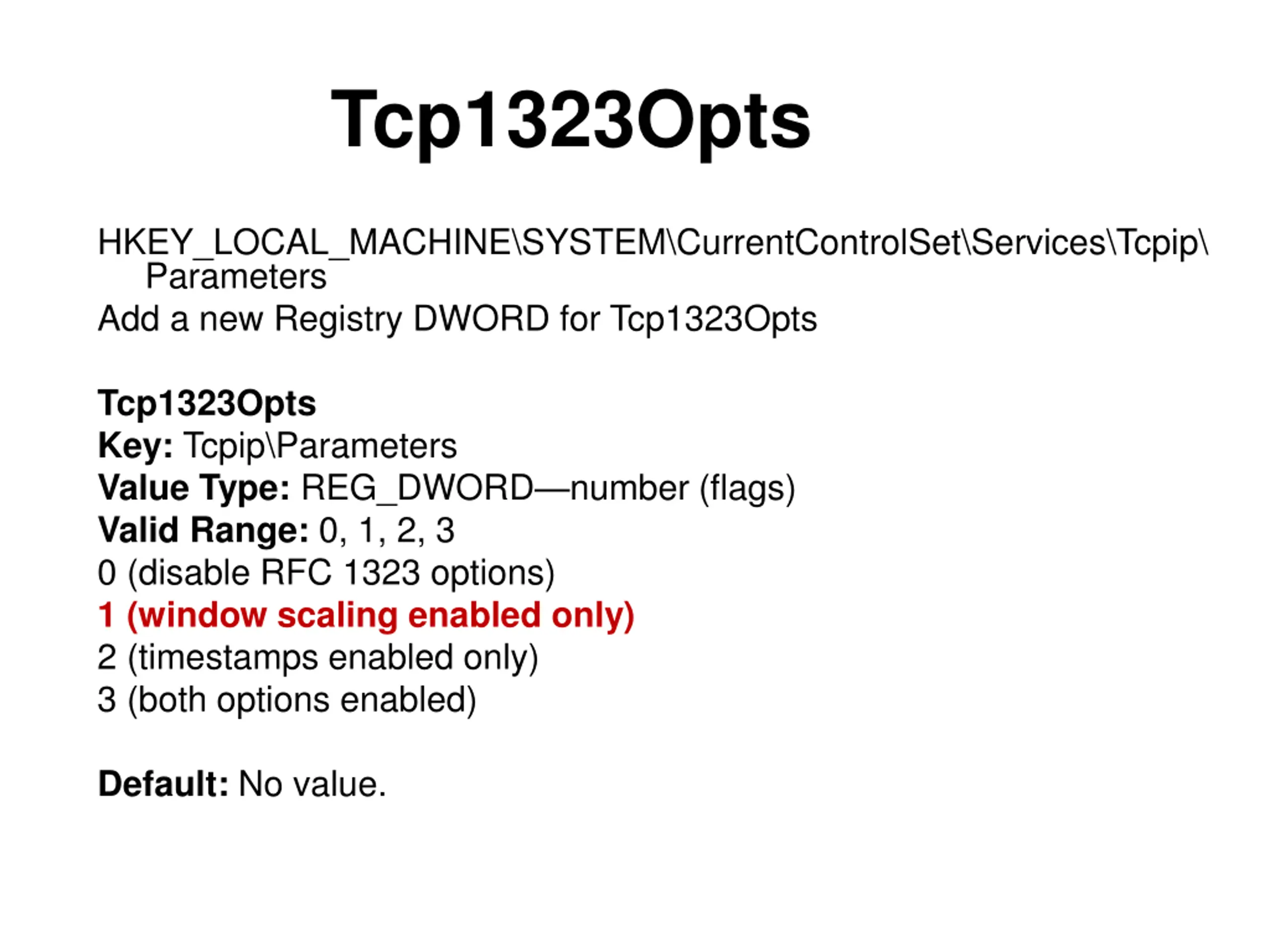 Tcp1323Opts HKEY_LOCAL_MACHINE\SYSTEM\CurrentControlSet\Services\Tcpip\ Parameters Add a new Registry DWORD for Tcp1323Opts Tcp1323Opts Key: Tcpip\Parameters Value Type: REG_DWORD number (flags) Valid Range: 0, 1, 2, 3 0 (disable RFC 1323 options) 1 (window scaling enabled only) 2 (timestamps enabled only) 3 (both options enabled) Default: No value.
