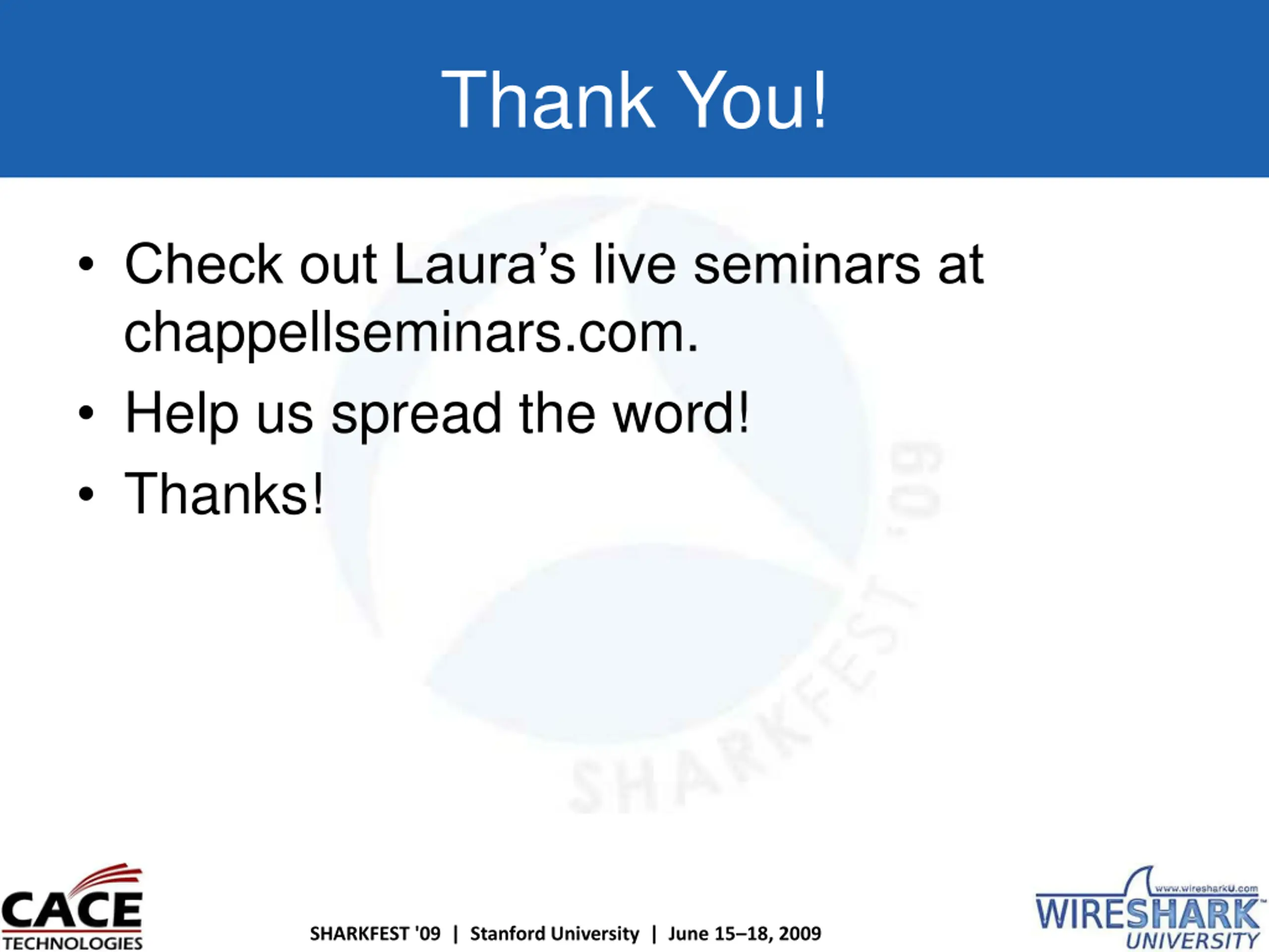 Thank You! Check out Laura s live seminars at chappellseminars.com. Help us spread the word! Thanks! SHARKFEST '09 | Stanford University | June 15 18, 2009