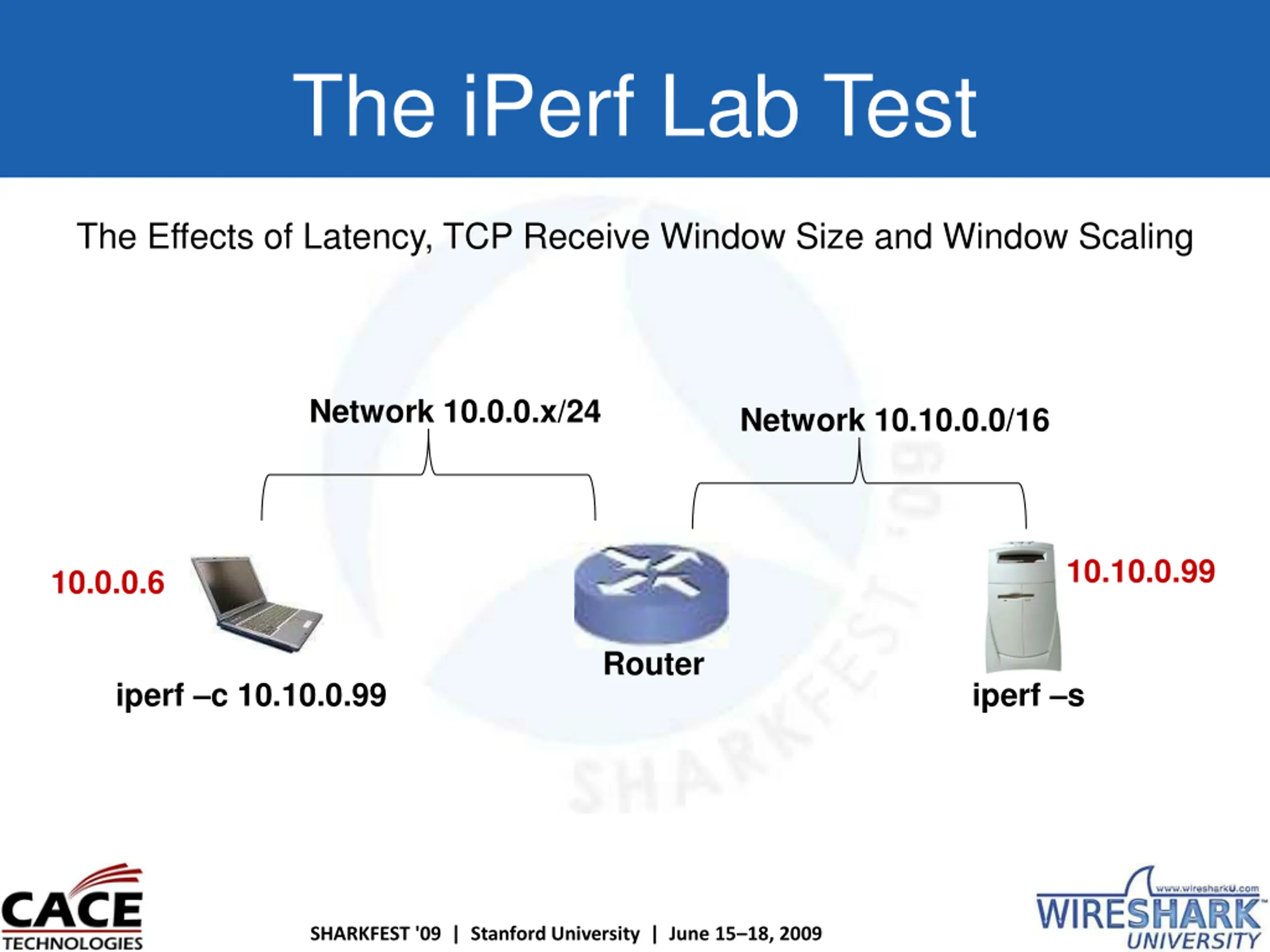 The iPerf Lab Test The Effects of Latency, TCP Receive Window Size and Window Scaling Network 10.0.0.x/24 Network 10.10.0.0/16 10.10.0.99 10.0.0.6 Router iperf c 10.10.0.99 iperf s SHARKFEST '09 | Stanford University | June 15 18, 2009