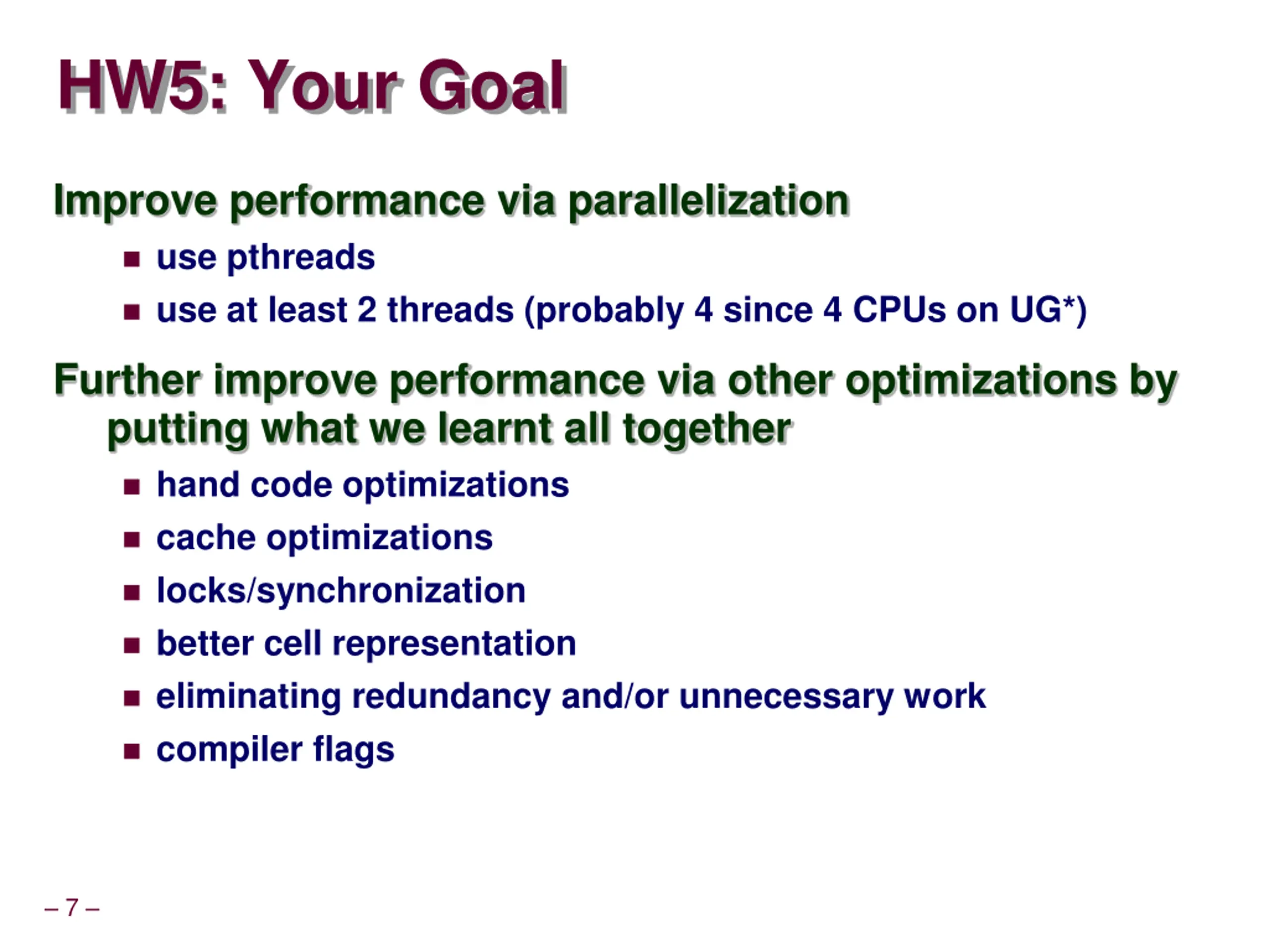 HW5: Your Goal Improve performance via parallelization use pthreads use at least 2 threads (probably 4 since 4 CPUs on UG*) Further improve performance via other optimizations by putting what we learnt all together hand code optimizations cache optimizations locks/synchronization better cell representation eliminating redundancy and/or unnecessary work compiler flags 7