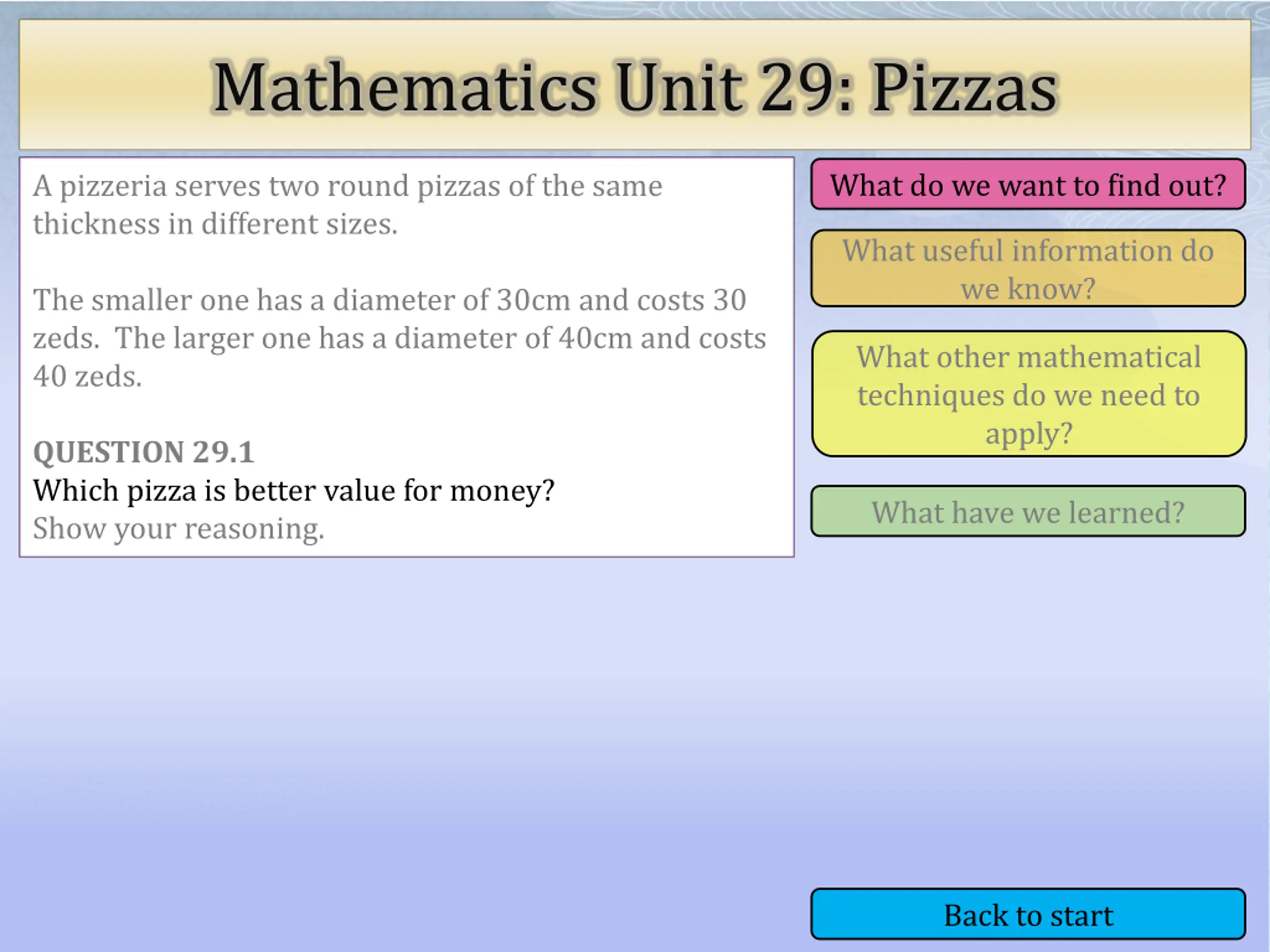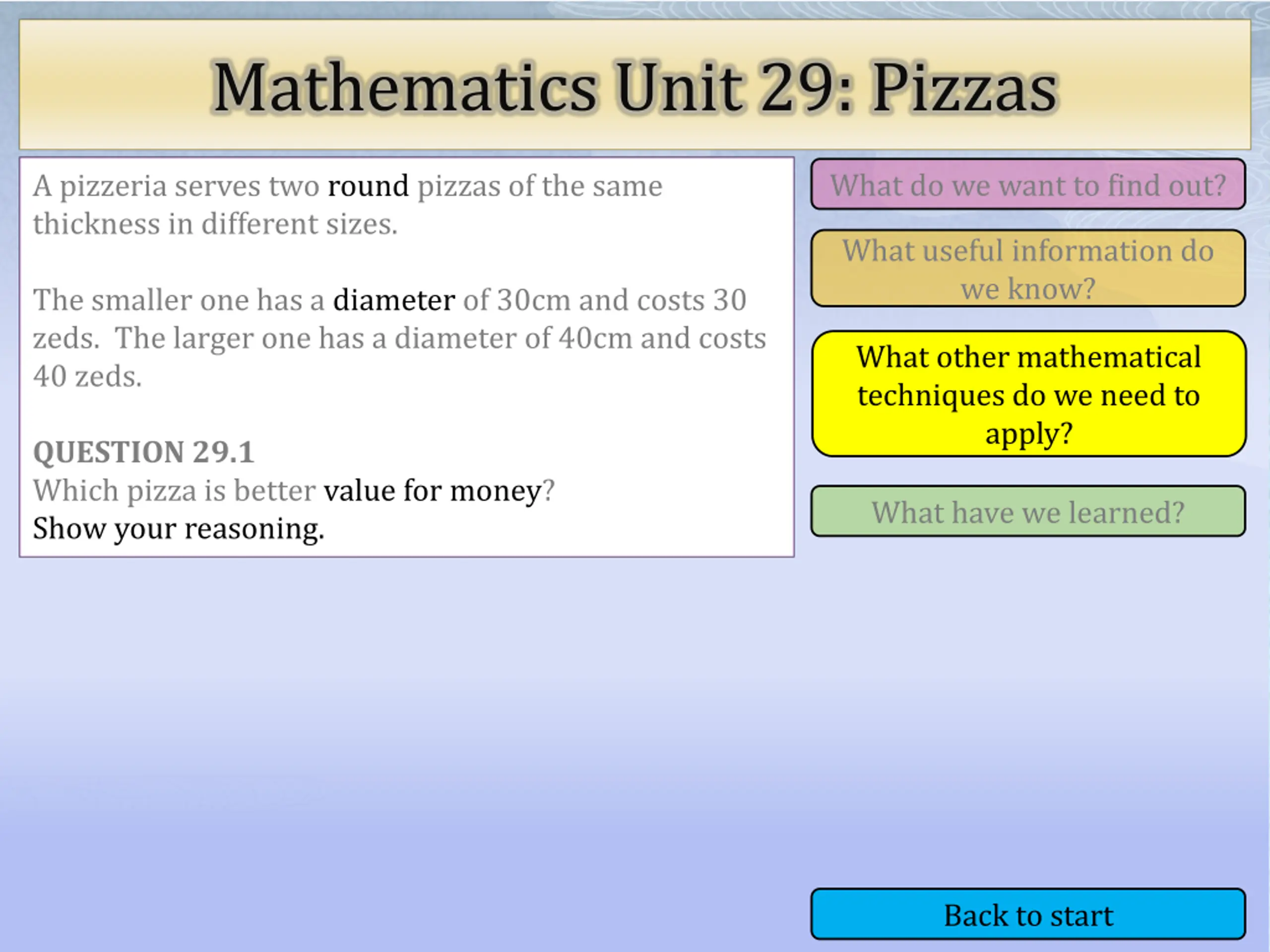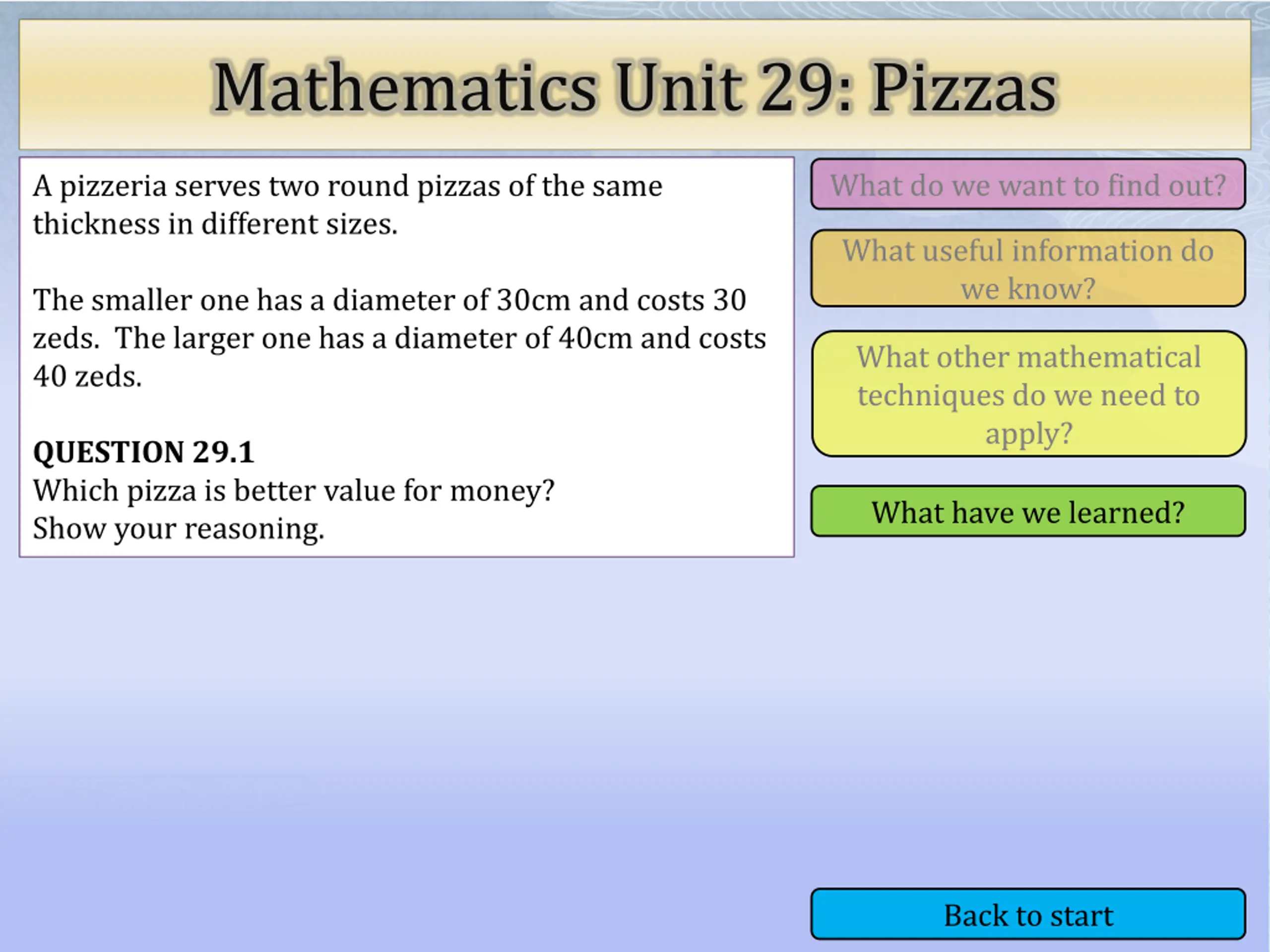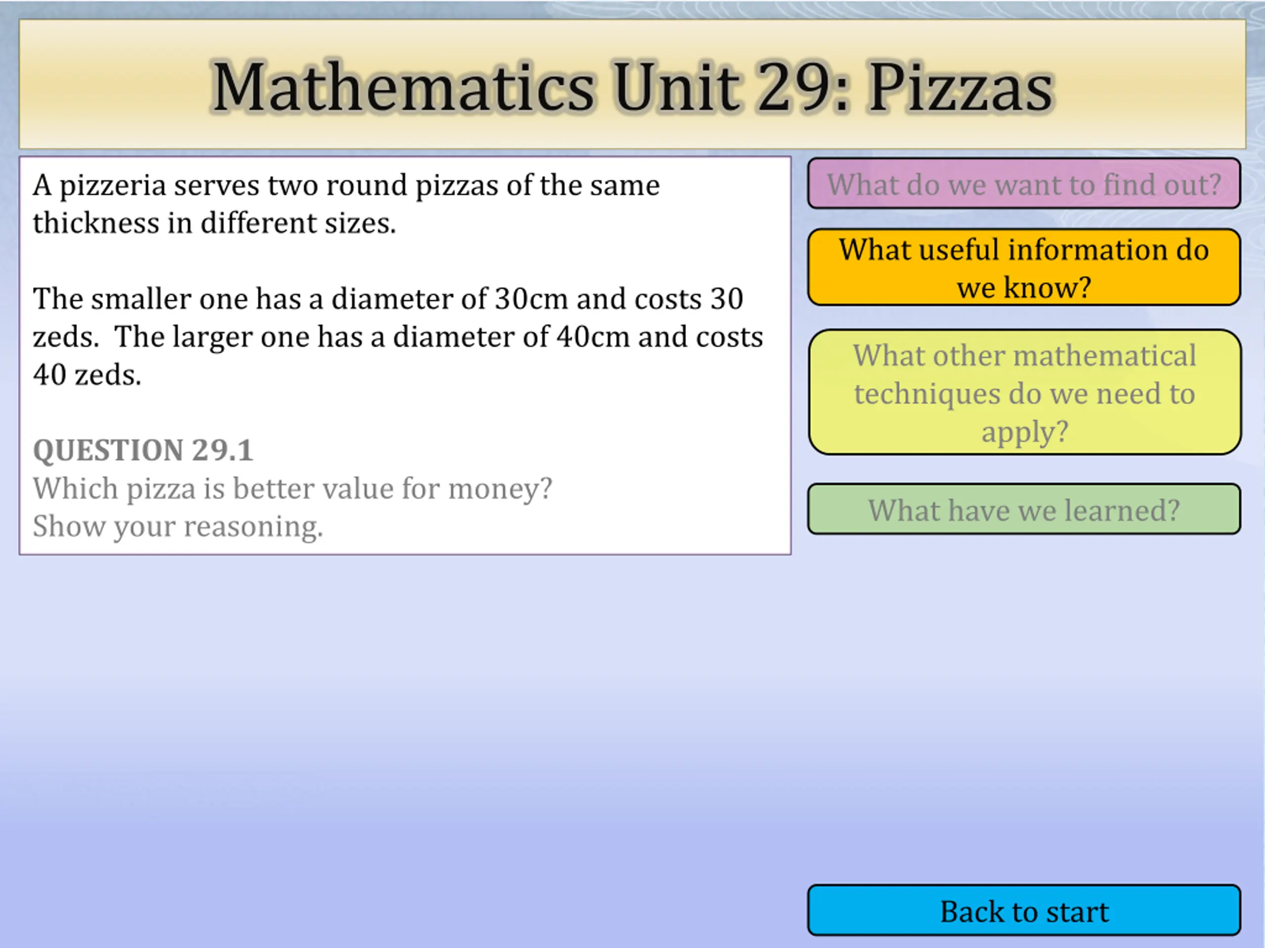 Mathematics Unit 29: Pizzas What do we want to find out? What do we want to find out? A pizzeria serves two round pizzas of the same thickness in different sizes. What useful information do we know? The smaller one has a diameter of 30cm and costs 30 zeds. The larger one has a diameter of 40cm and costs 40 zeds. What other mathematical techniques do we need to apply? What other mathematical techniques do we need to apply? QUESTION 29.1 Which pizza is better value for money? Show your reasoning. What have we learned? What have we learned? Back to start Back to start