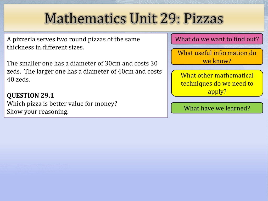 Mathematics Unit 29: Pizzas What do we want to find out? What do we want to find out? A pizzeria serves two round pizzas of the same thickness in different sizes. What useful information do we know? What useful information do we know? The smaller one has a diameter of 30cm and costs 30 zeds. The larger one has a diameter of 40cm and costs 40 zeds. What other mathematical techniques do we need to apply? What other mathematical techniques do we need to apply? QUESTION 29.1 Which pizza is better value for money? Show your reasoning. What have we learned? What have we learned?