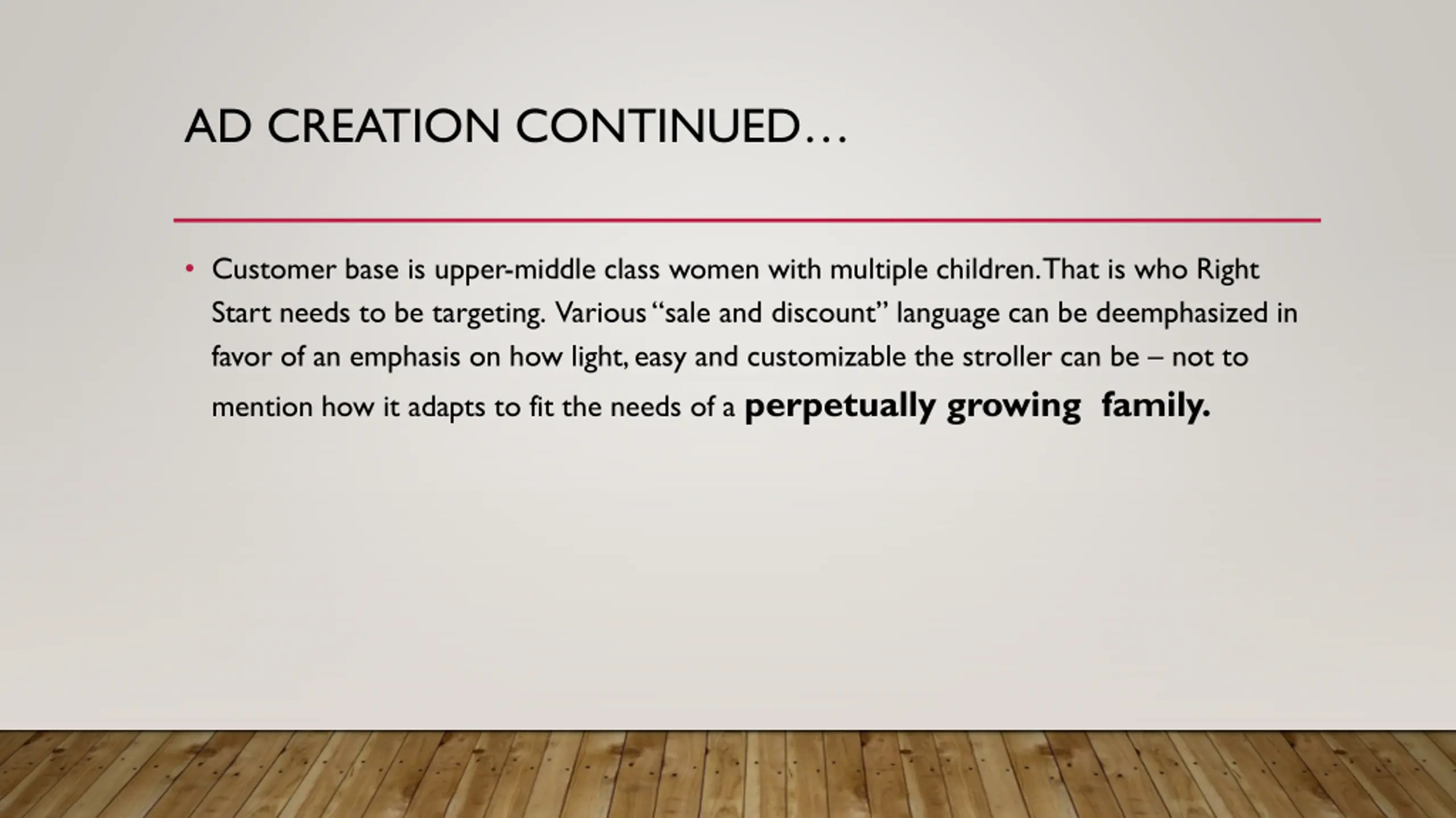 AD CREATION CONTINUED Customer base is upper-middle class women with multiple children. That is who Right Start needs to be targeting. Various sale and discount language can be deemphasized in favor of an emphasis on how light, easy and customizable the stroller can be not to mention how it adapts to fit the needs of a perpetually growing family.