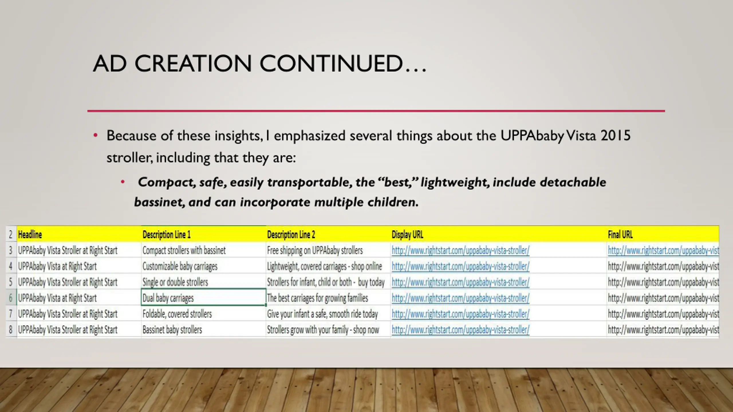 AD CREATION CONTINUED Because of these insights, I emphasized several things about the UPPAbabyVista 2015 stroller, including that they are: Compact, safe, easily transportable, the best, lightweight, include detachable bassinet, and can incorporate multiple children.