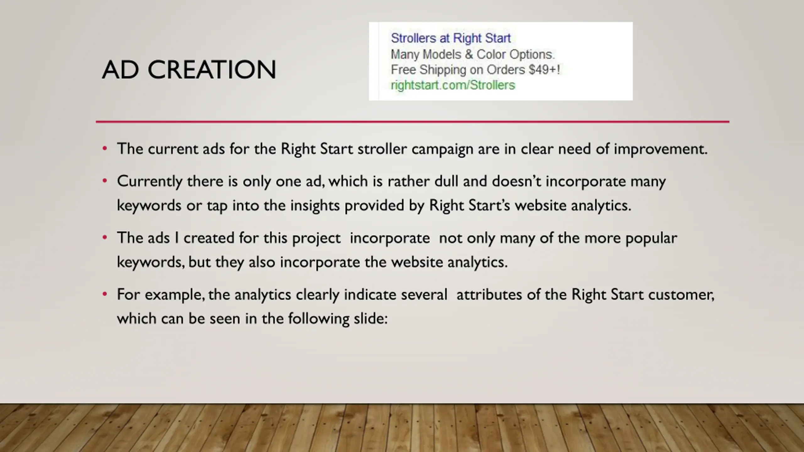 AD CREATION The current ads for the Right Start stroller campaign are in clear need of improvement. Currently there is only one ad, which is rather dull and doesn t incorporate many keywords or tap into the insights provided by Right Start s website analytics. The ads I created for this project incorporate not only many of the more popular keywords, but they also incorporate the website analytics. For example, the analytics clearly indicate several attributes of the Right Start customer, which can be seen in the following slide: