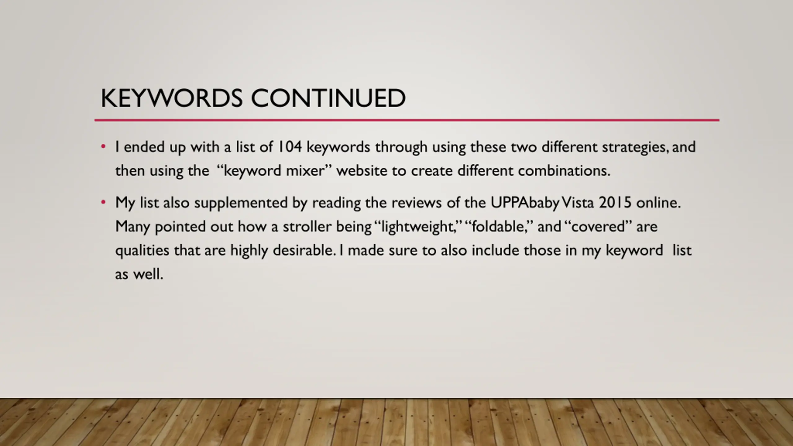 KEYWORDS CONTINUED I ended up with a list of 104 keywords through using these two different strategies, and then using the keyword mixer website to create different combinations. My list also supplemented by reading the reviews of the UPPAbabyVista 2015 online. Many pointed out how a stroller being lightweight, foldable, and covered are qualities that are highly desirable. I made sure to also include those in my keyword list as well.