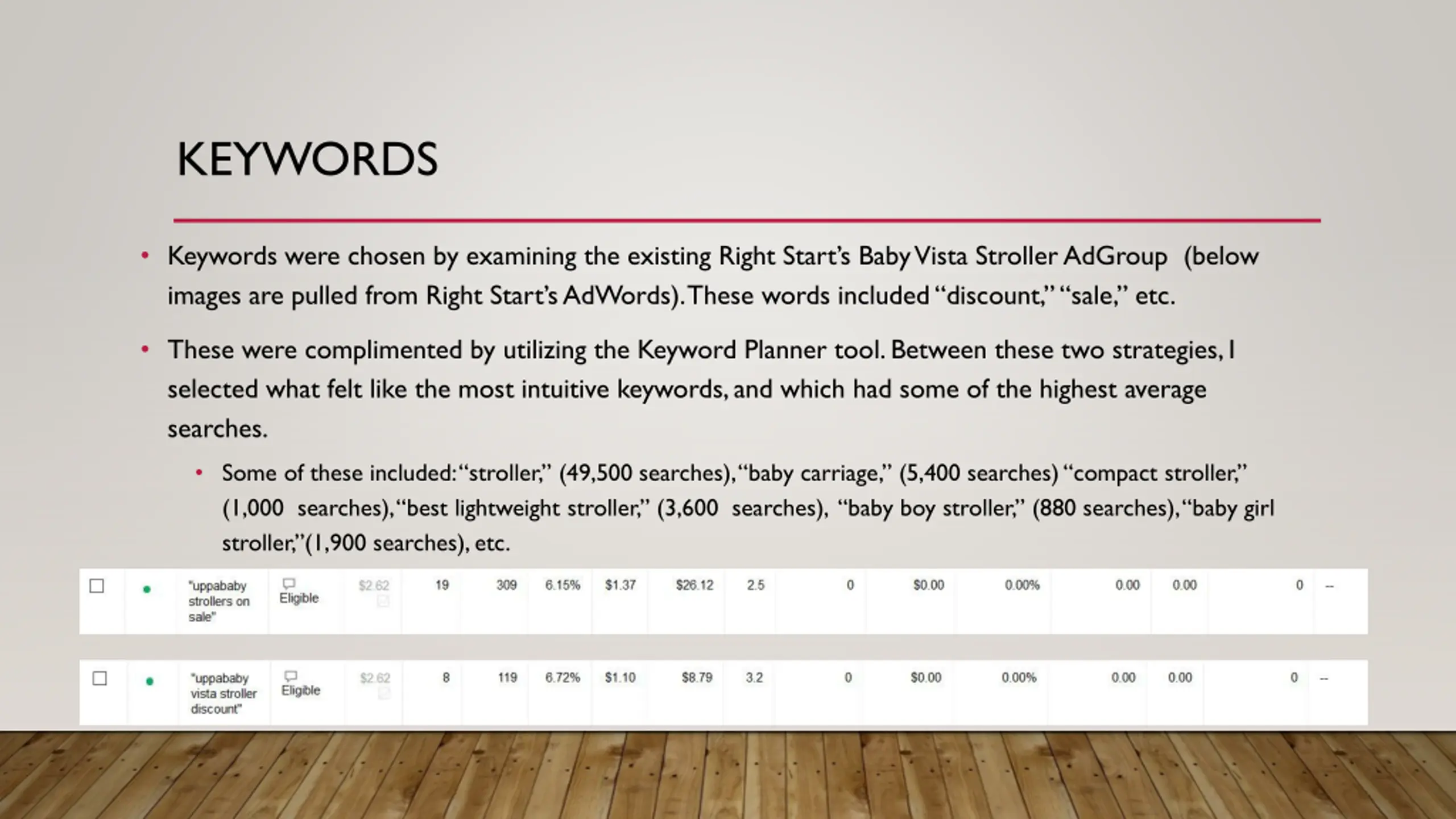 KEYWORDS Keywords were chosen by examining the existing Right Start s Baby Vista Stroller AdGroup (below images are pulled from Right Start s AdWords). These words included discount, sale, etc. These were complimented by utilizing the Keyword Planner tool. Between these two strategies, I selected what felt like the most intuitive keywords, and which had some of the highest average searches. Some of these included: stroller, (49,500 searches), baby carriage, (5,400 searches) compact stroller, (1,000 searches), best lightweight stroller, (3,600 searches), baby boy stroller, (880 searches), baby girl stroller, (1,900 searches), etc.