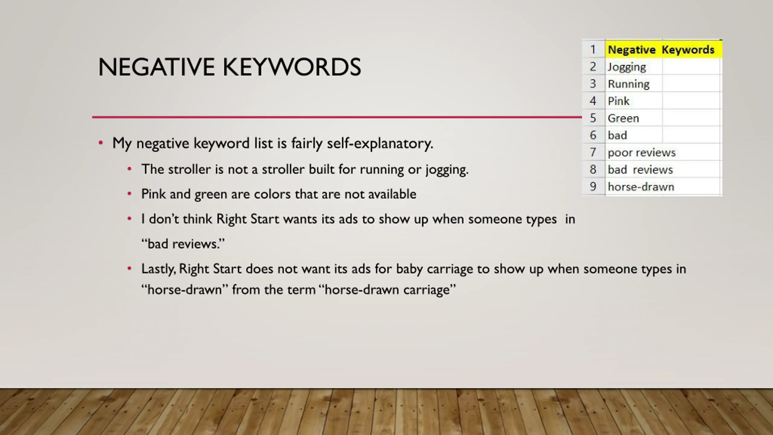 NEGATIVE KEYWORDS My negative keyword list is fairly self-explanatory. The stroller is not a stroller built for running or jogging. Pink and green are colors that are not available I don t think Right Start wants its ads to show up when someone types in bad reviews. Lastly, Right Start does not want its ads for baby carriage to show up when someone types in horse-drawn from the term horse-drawn carriage
