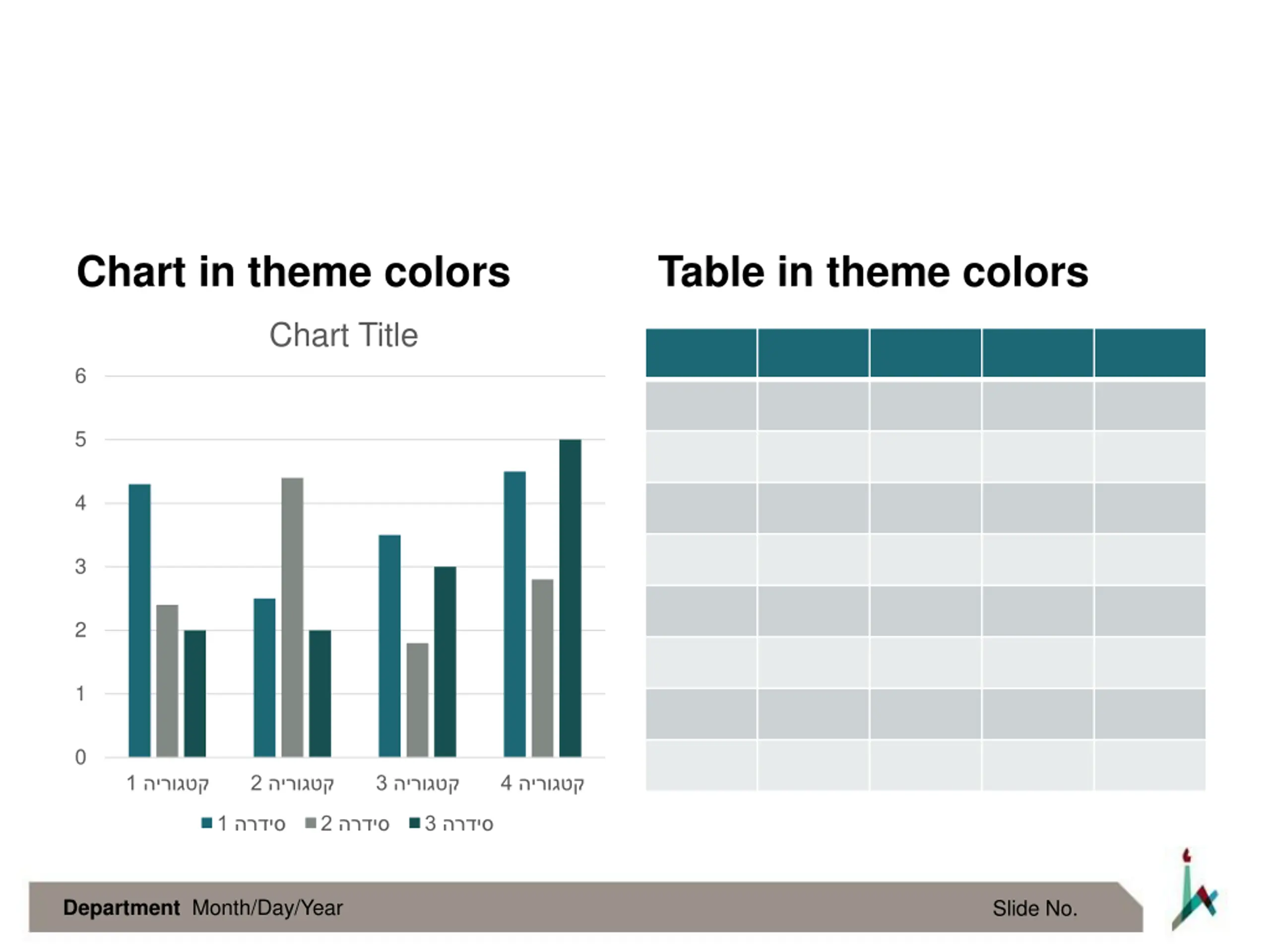 Chart in theme colors Table in theme colors Chart Title 6 5 4 3 2 1 0 1 2 3 4 1 2 3 Department Month/Day/Year Slide No.