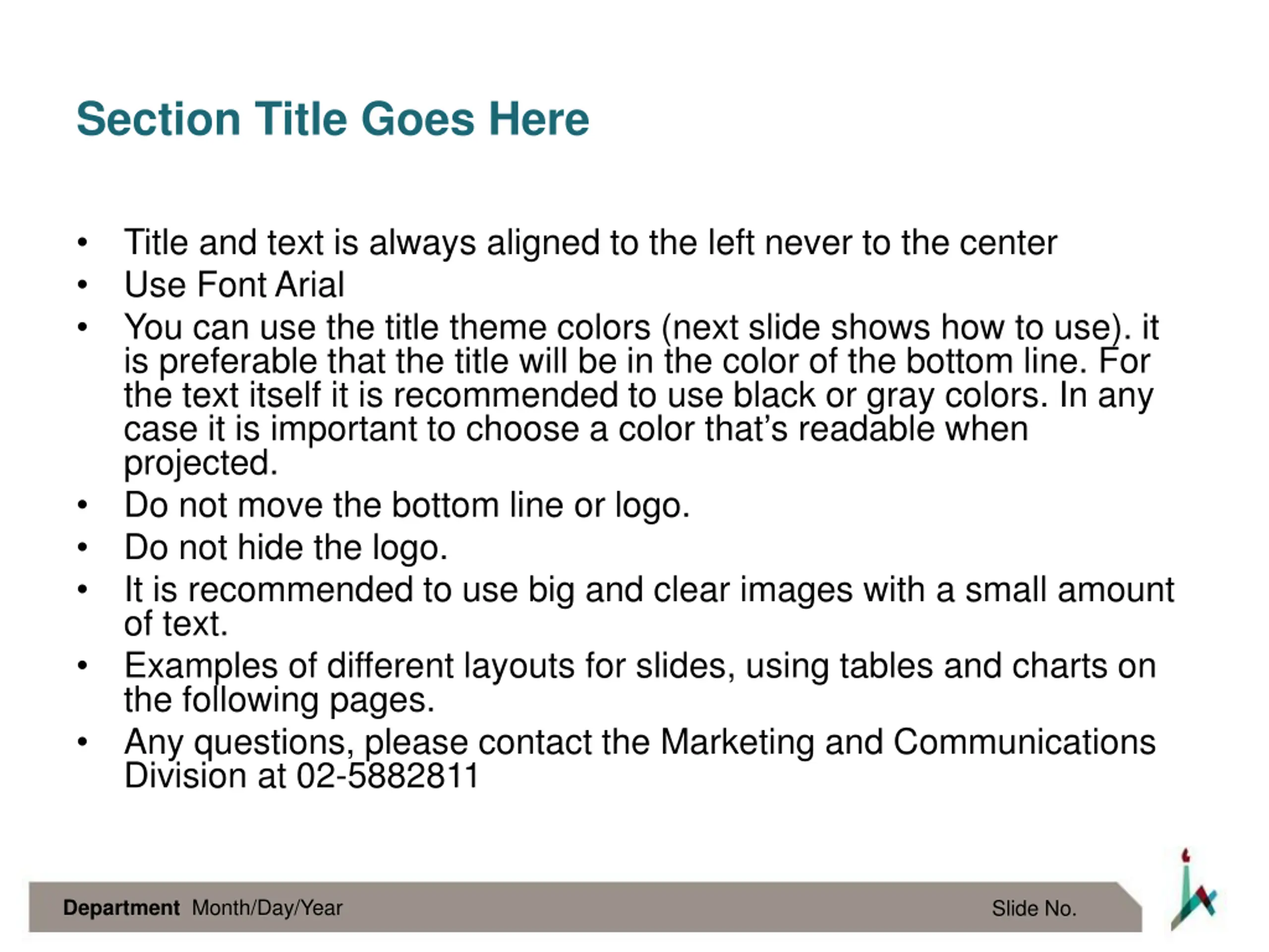 Section Title Goes Here Title and text is always aligned to the left never to the center Use Font Arial You can use the title theme colors (next slide shows how to use). it is preferable that the title will be in the color of the bottom line. For the text itself it is recommended to use black or gray colors. In any case it is important to choose a color that s readable when projected. Do not move the bottom line or logo. Do not hide the logo. It is recommended to use big and clear images with a small amount of text. Examples of different layouts for slides, using tables and charts on the following pages. Any questions, please contact the Marketing and Communications Division at 02-5882811 Department Month/Day/Year Slide No.