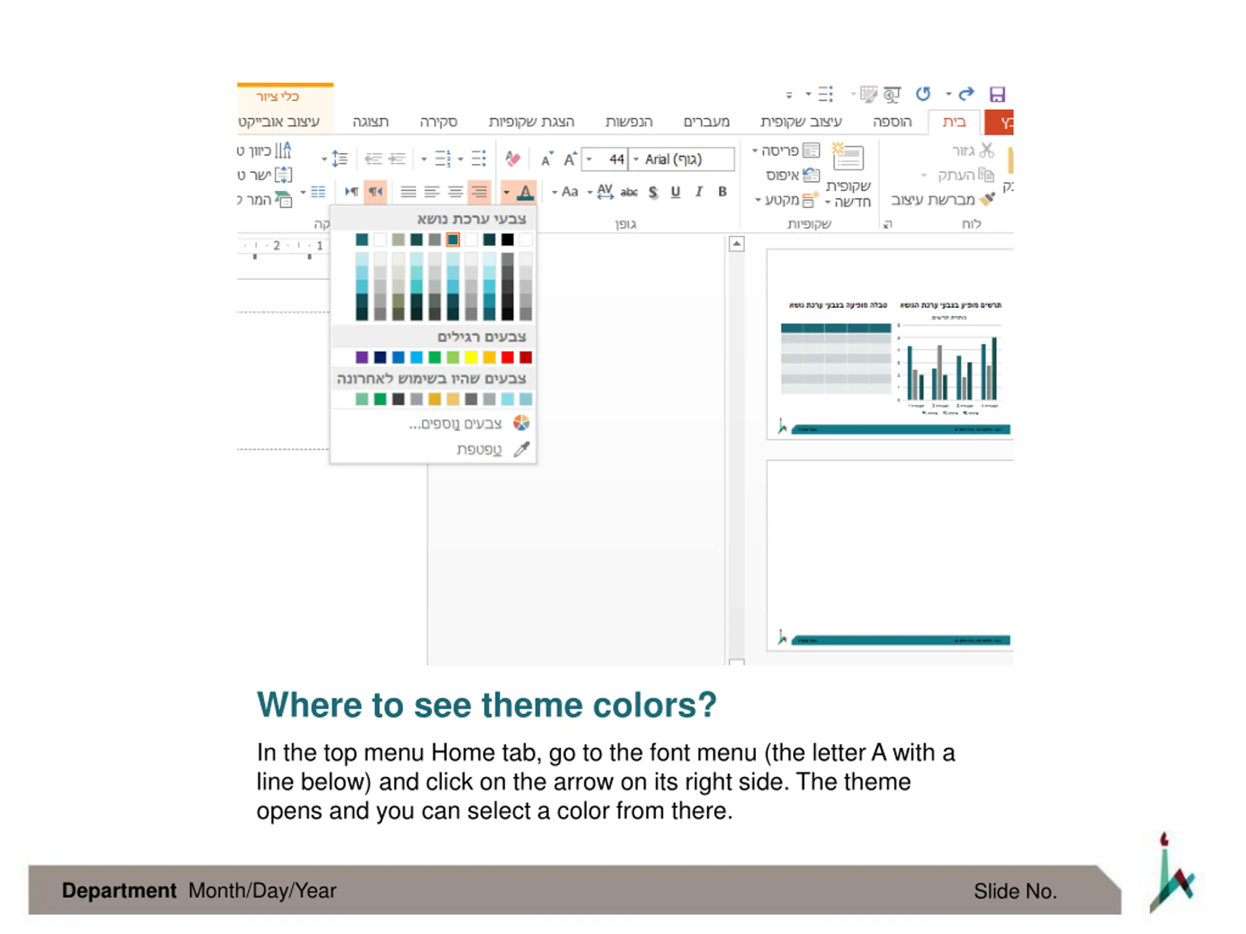 Where to see theme colors? In the top menu Home tab, go to the font menu (the letter A with a line below) and click on the arrow on its right side. The theme opens and you can select a color from there. Department Month/Day/Year Slide No.