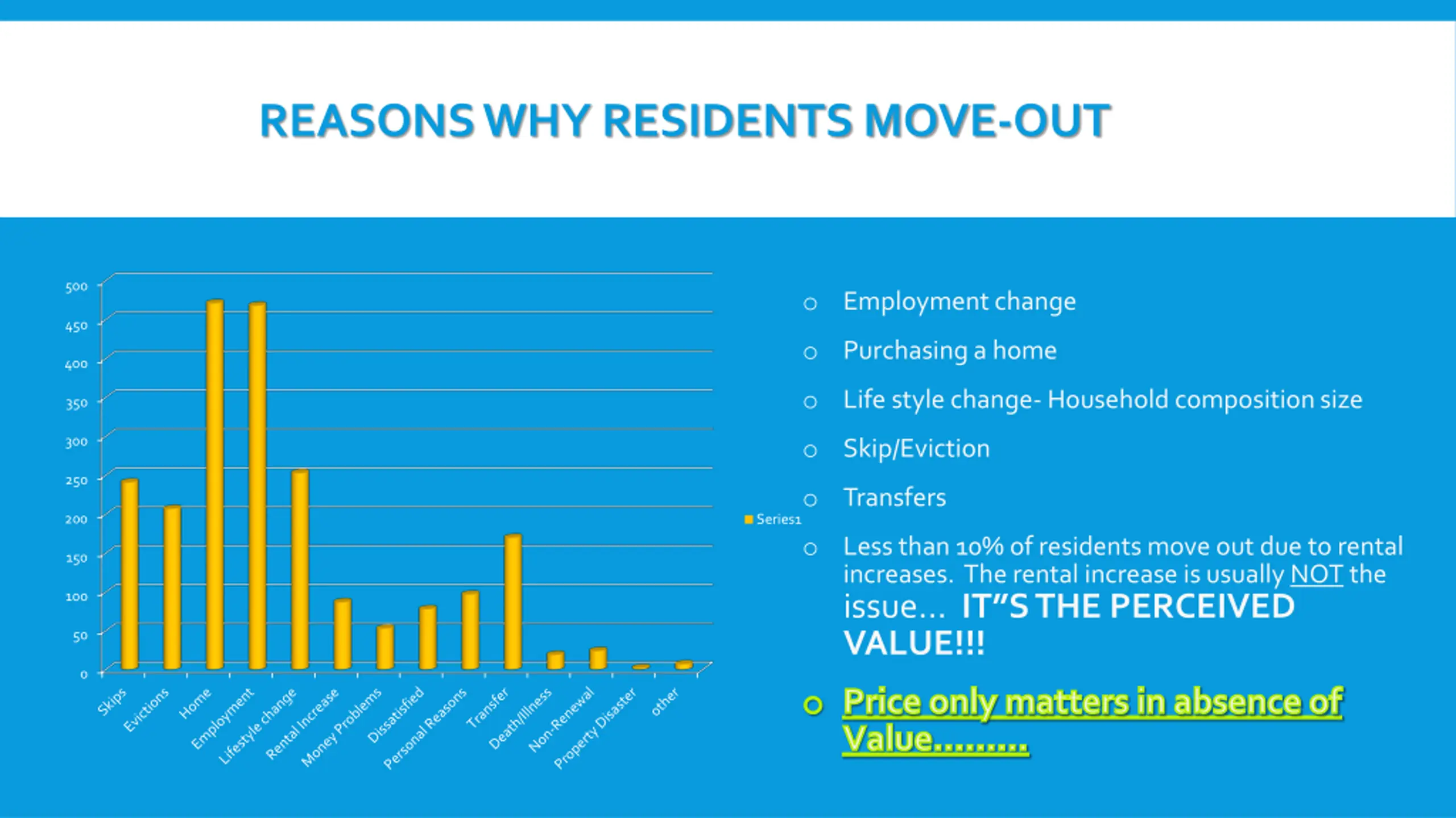 REASONS WHY RESIDENTS MOVE-OUT 500 o Employment change 450 o Purchasing a home 400 o Life style change- Household composition size 350 o Skip/Eviction 300 250 o Transfers 200 Series1 o Less than 10% of residents move out due to rental increases. The rental increase is usually NOT the issue IT S THE PERCEIVED VALUE!!! 150 100 50 0 Price only matters in absence of Value