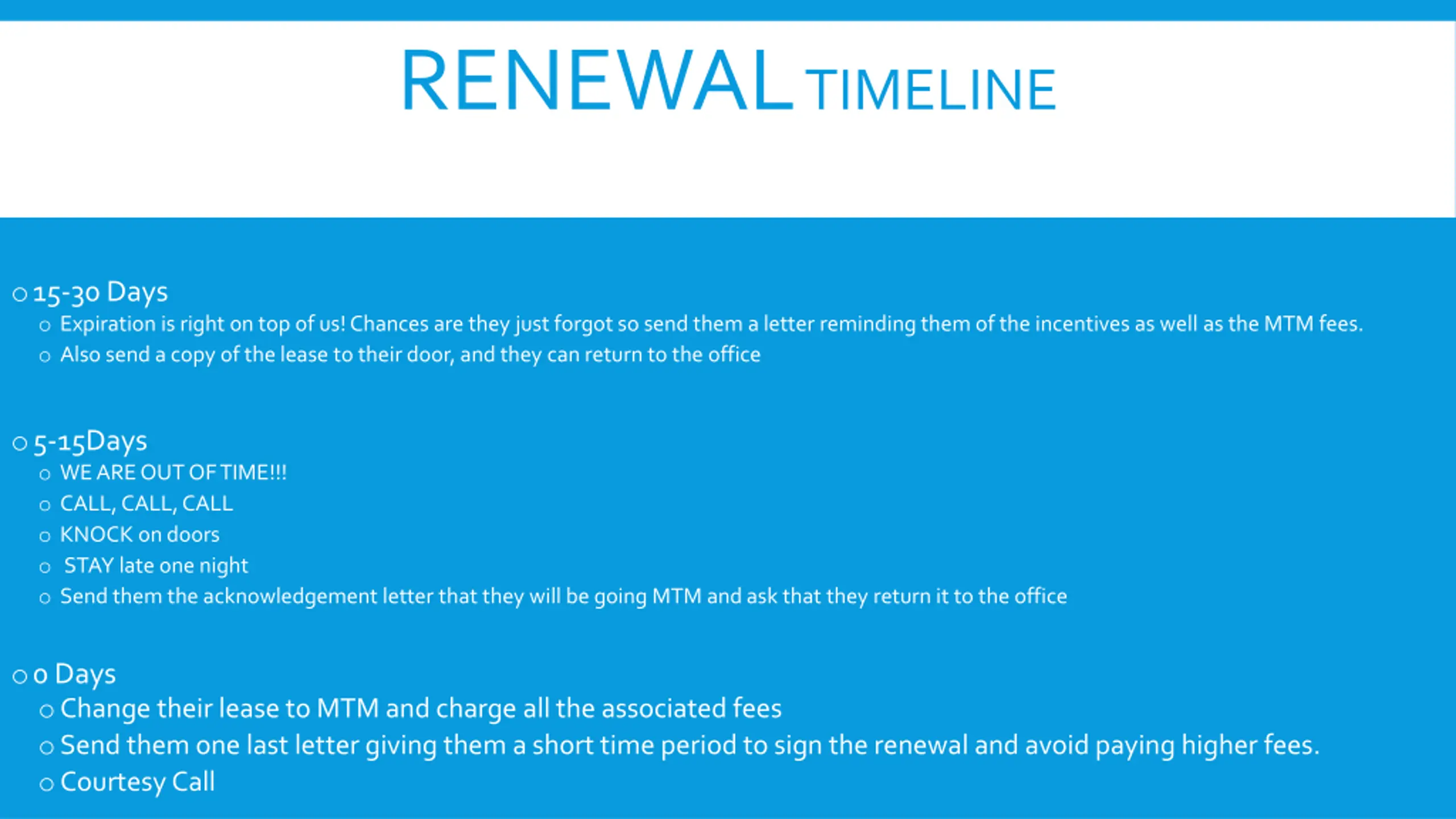 RENEWAL TIMELINE o15-30 Days o Expiration is right on top of us! Chances are they just forgot so send them a letter reminding them of the incentives as well as the MTM fees. o Also send a copy of the lease to their door, and they can return to the office o5-15Days o WE ARE OUT OF TIME!!! o CALL, CALL, CALL o KNOCK on doors o STAY late one night o Send them the acknowledgement letter that they will be going MTM and ask that they return it to the office o0 Days oChange their lease to MTM and charge all the associated fees oSend them one last letter giving them a short time period to sign the renewal and avoid paying higher fees. oCourtesy Call