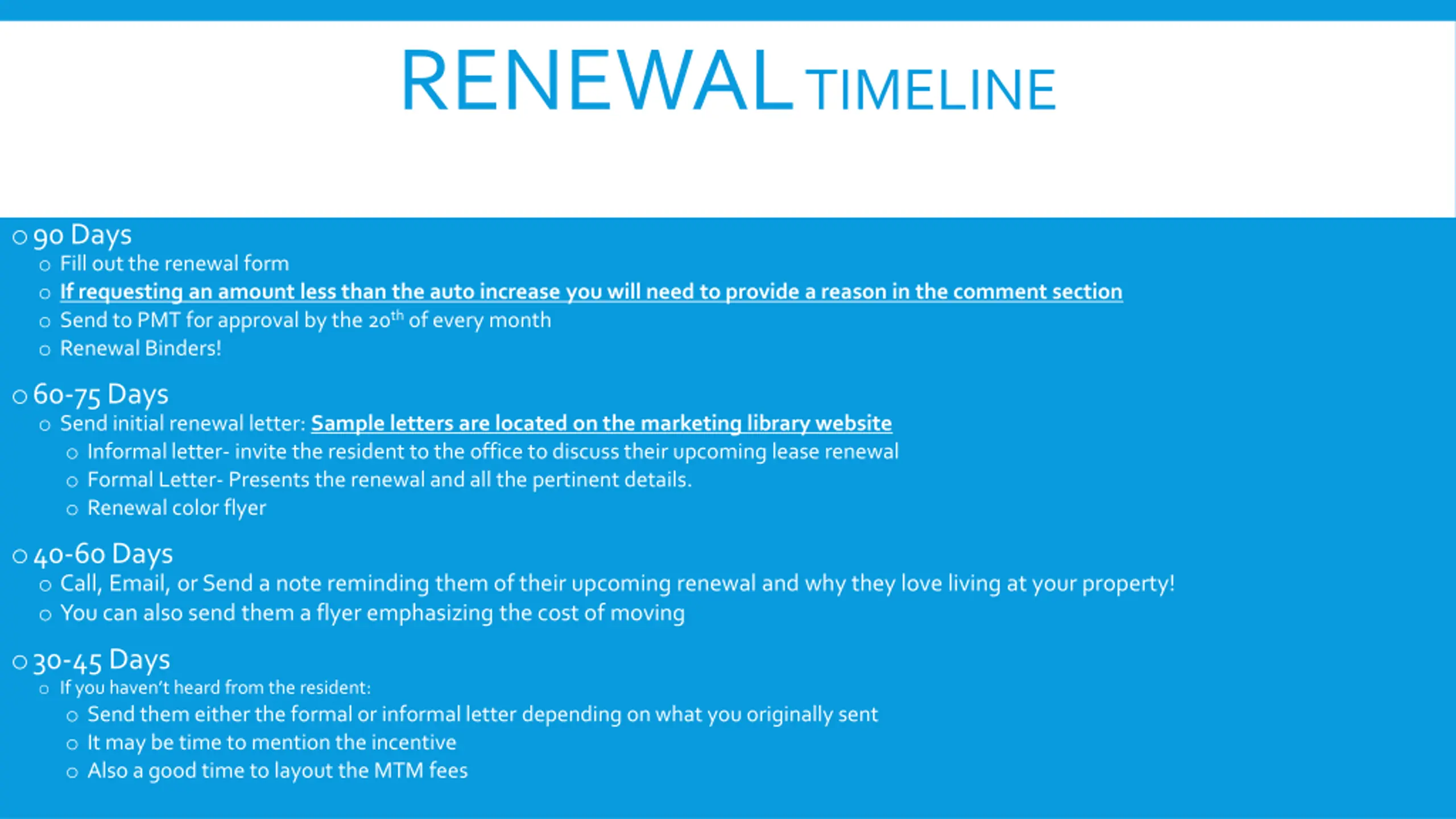 RENEWAL TIMELINE o90 Days o Fill out the renewal form o If requesting an amount less than the auto increase you will need to provide a reason in the comment section o Send to PMT for approval by the 20th of every month o Renewal Binders! o60-75 Days o Send initial renewal letter: Sample letters are located on the marketing library website o Informal letter- invite the resident to the office to discuss their upcoming lease renewal o Formal Letter- Presents the renewal and all the pertinent details. o Renewal color flyer o40-60 Days o Call, Email, or Send a note reminding them of their upcoming renewal and why they love living at your property! o You can also send them a flyer emphasizing the cost of moving o30-45 Days o If you haven t heard from the resident: o Send them either the formal or informal letter depending on what you originally sent o It may be time to mention the incentive o Also a good time to layout the MTM fees