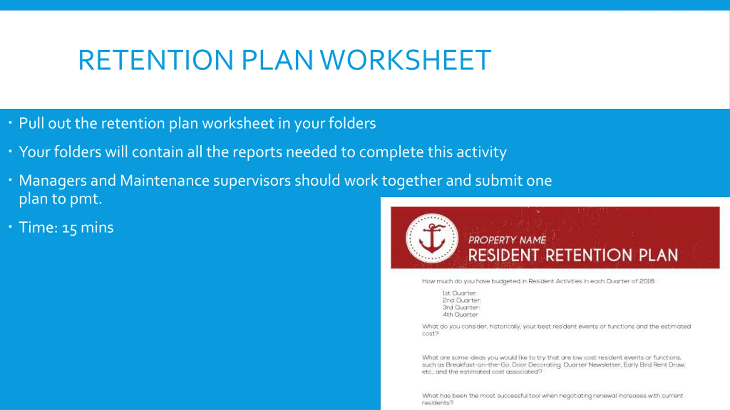 RETENTION PLAN WORKSHEET Pull out the retention plan worksheet in your folders Your folders will contain all the reports needed to complete this activity Managers and Maintenance supervisors should work together and submit one plan to pmt. Time: 15 mins