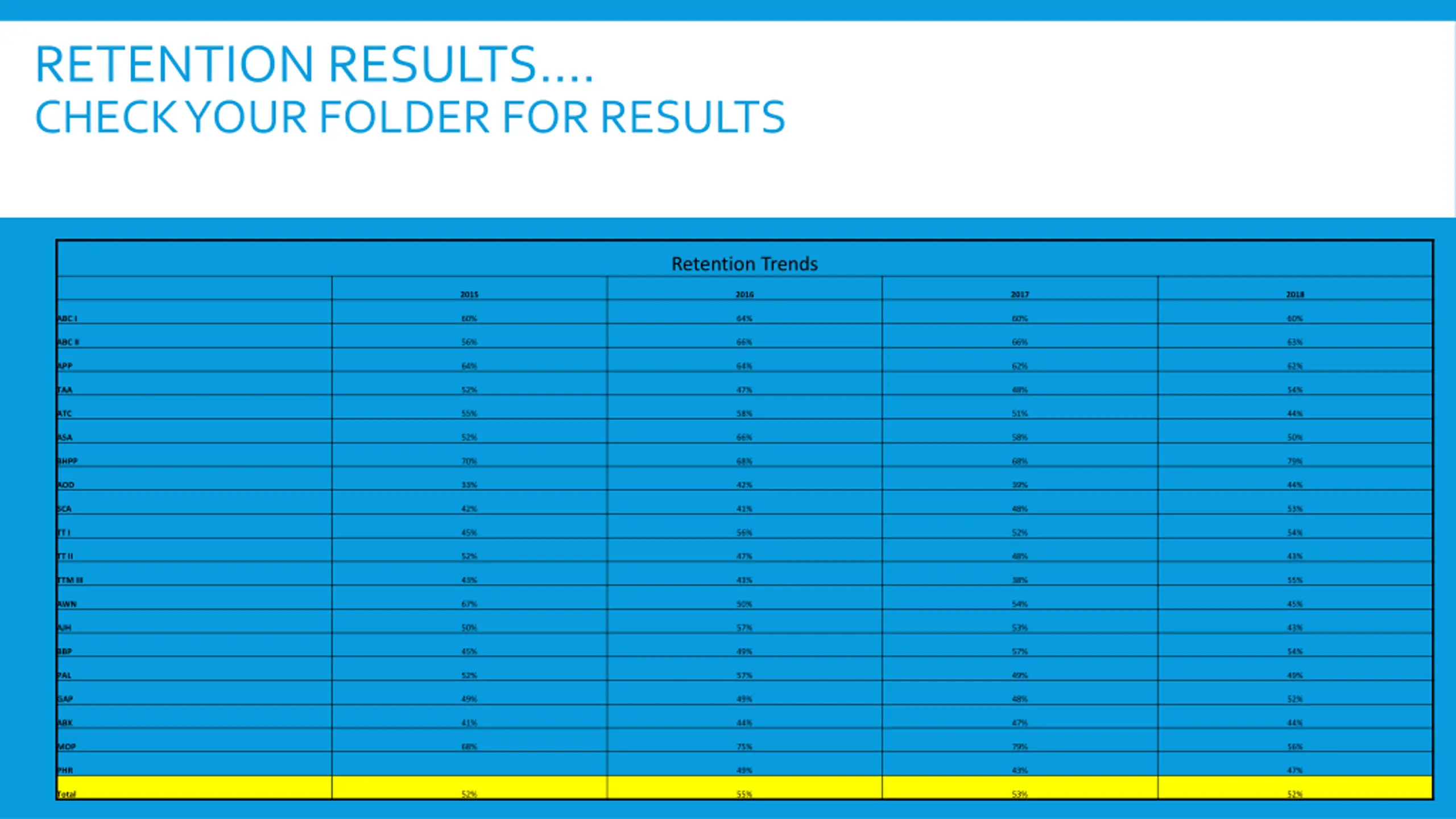 RETENTION RESULTS. CHECK YOUR FOLDER FOR RESULTS Retention Trends 2015 2016 2017 2018 ABC I 60% 64% 60% 60% ABC II 56% 66% 66% 63% APP 64% 64% 62% 62% TAA 52% 47% 48% 54% ATC 55% 58% 51% 44% ASA 52% 66% 58% 50% BHPP 70% 68% 68% 79% AOD 33% 42% 39% 44% SCA 42% 41% 48% 53% TT I 45% 56% 52% 54% TT II 52% 47% 48% 43% TTM III 43% 43% 38% 55% AWN 67% 50% 54% 45% AJH 50% 57% 53% 43% BBP 45% 49% 57% 54% PAL 52% 57% 49% 49% GAP 49% 49% 48% 52% ABX 41% 44% 47% 44% MOP 68% 75% 79% 56% PHR 49% 43% 47% Total 52% 55% 53% 52%