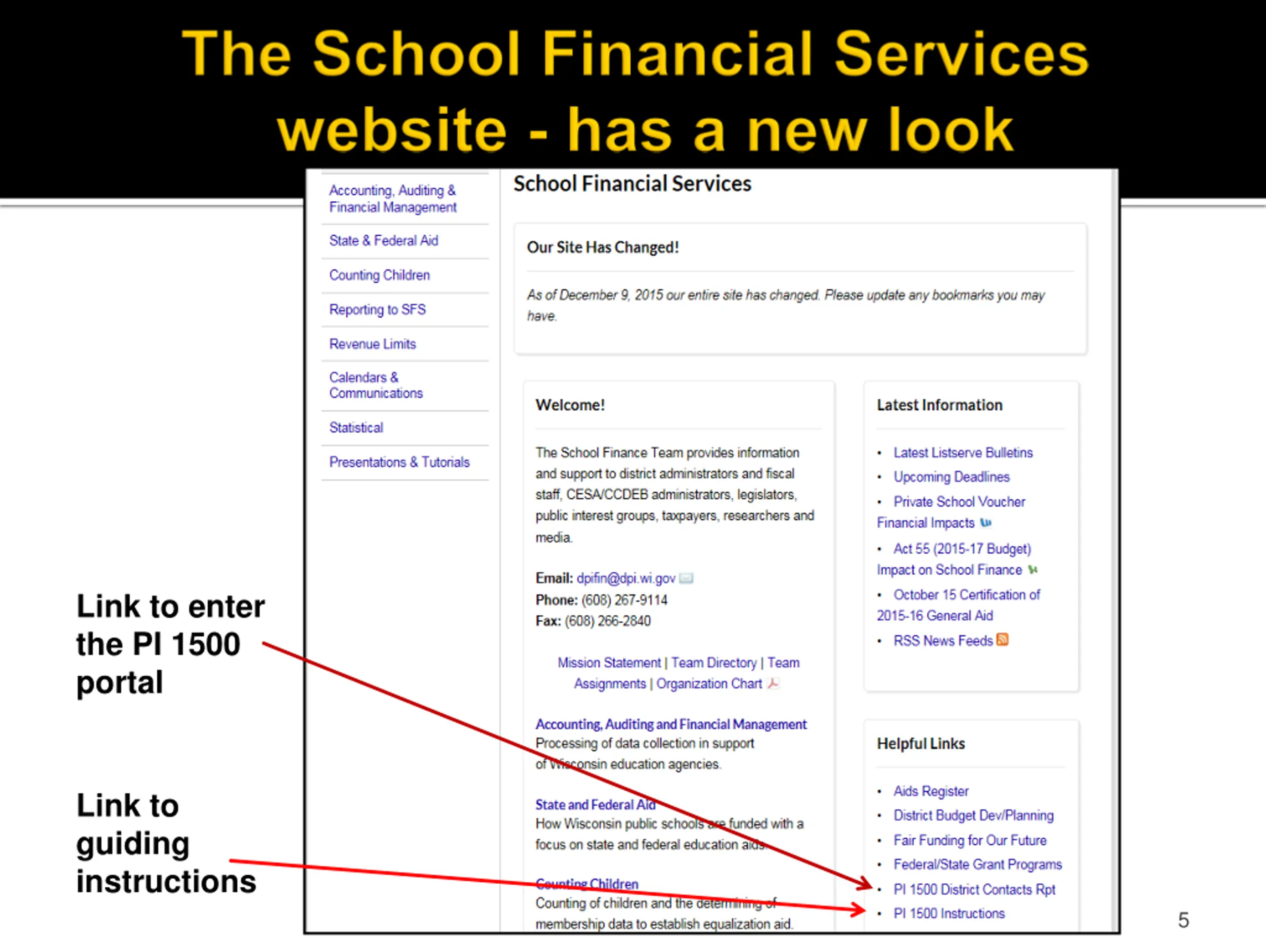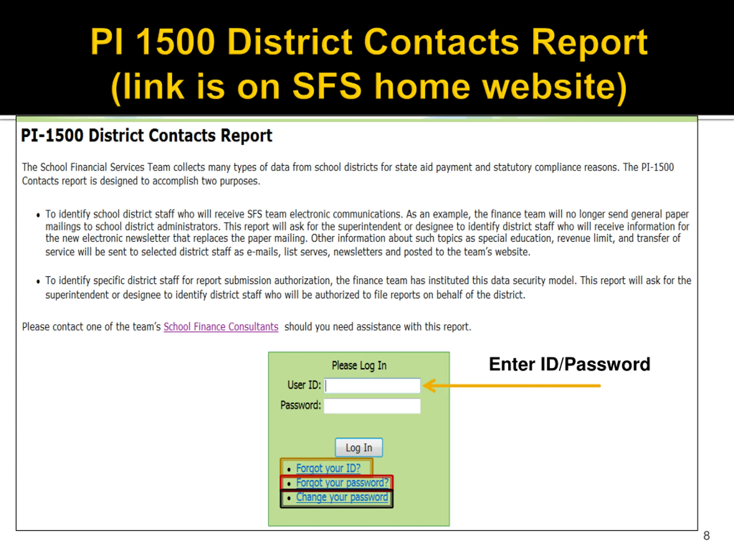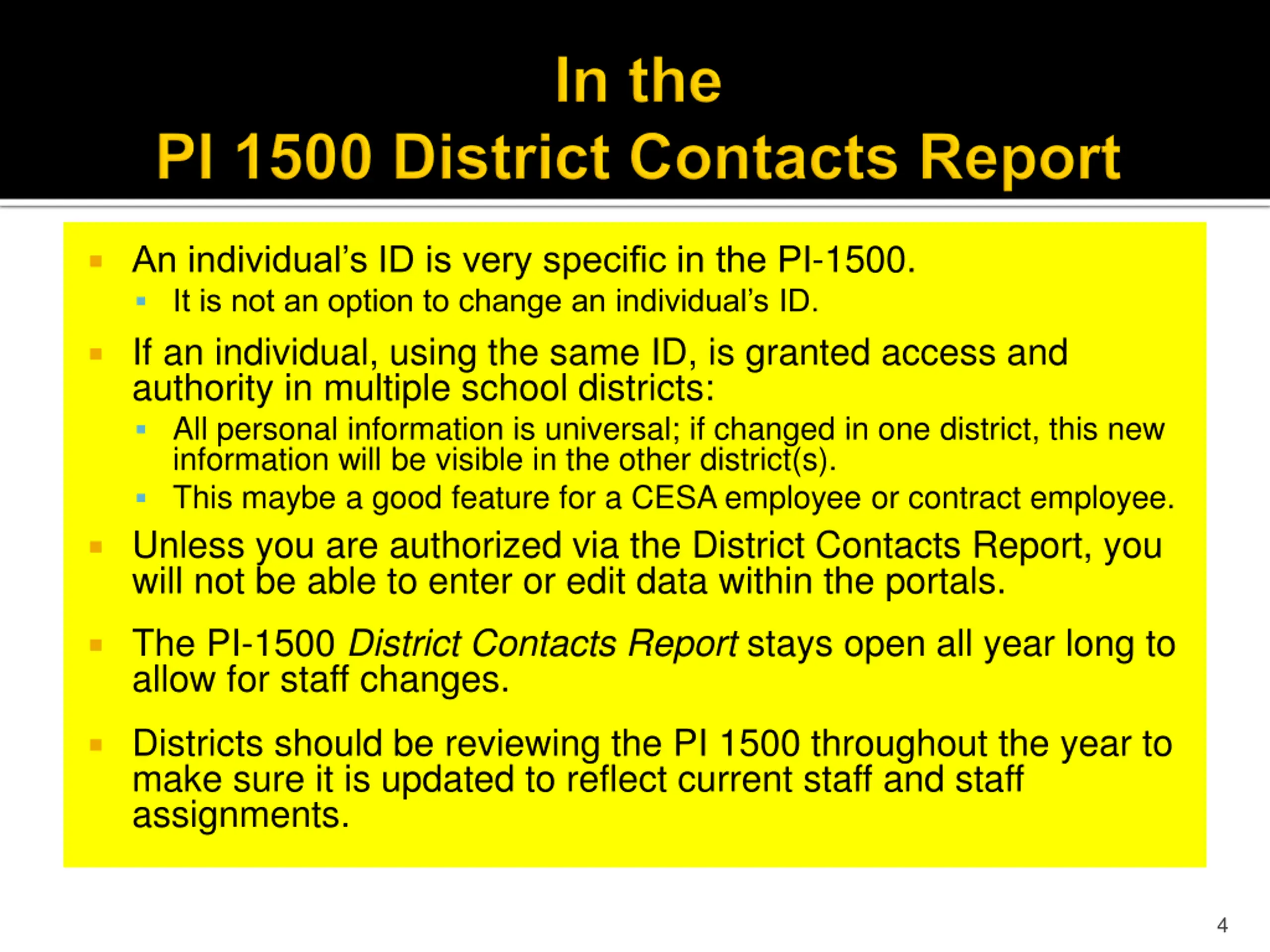 An individuals ID is very specific in the PI-1500. It is not an option to change an individual s ID. If an individual, using the same ID, is granted access and authority in multiple school districts: All personal information is universal; if changed in one district, this new information will be visible in the other district(s). This maybe a good feature for a CESA employee or contract employee. Unless you are authorized via the District Contacts Report, you will not be able to enter or edit data within the portals. The PI-1500 District Contacts Report stays open all year long to allow for staff changes. Districts should be reviewing the PI 1500 throughout the year to make sure it is updated to reflect current staff and staff assignments. 4