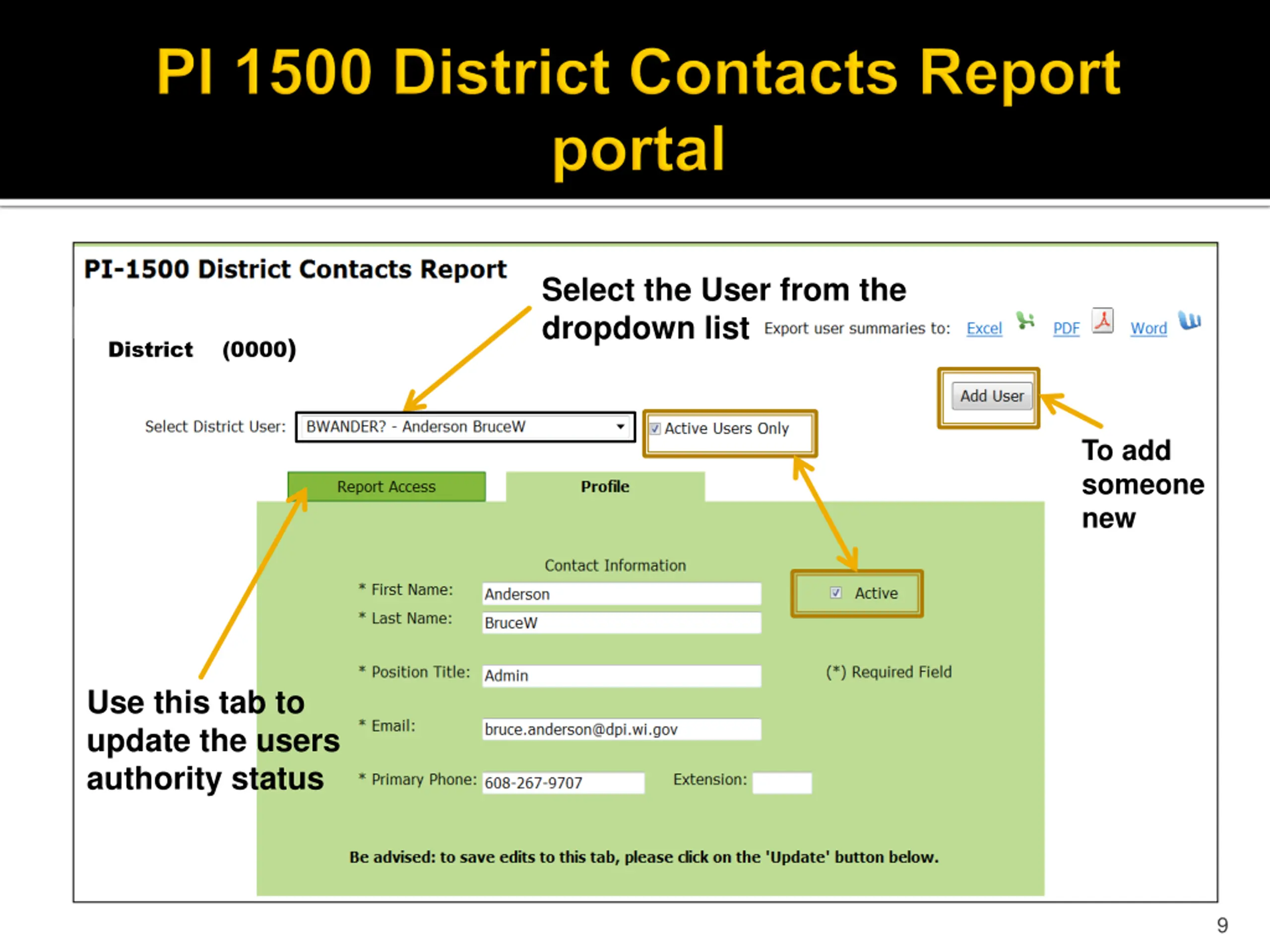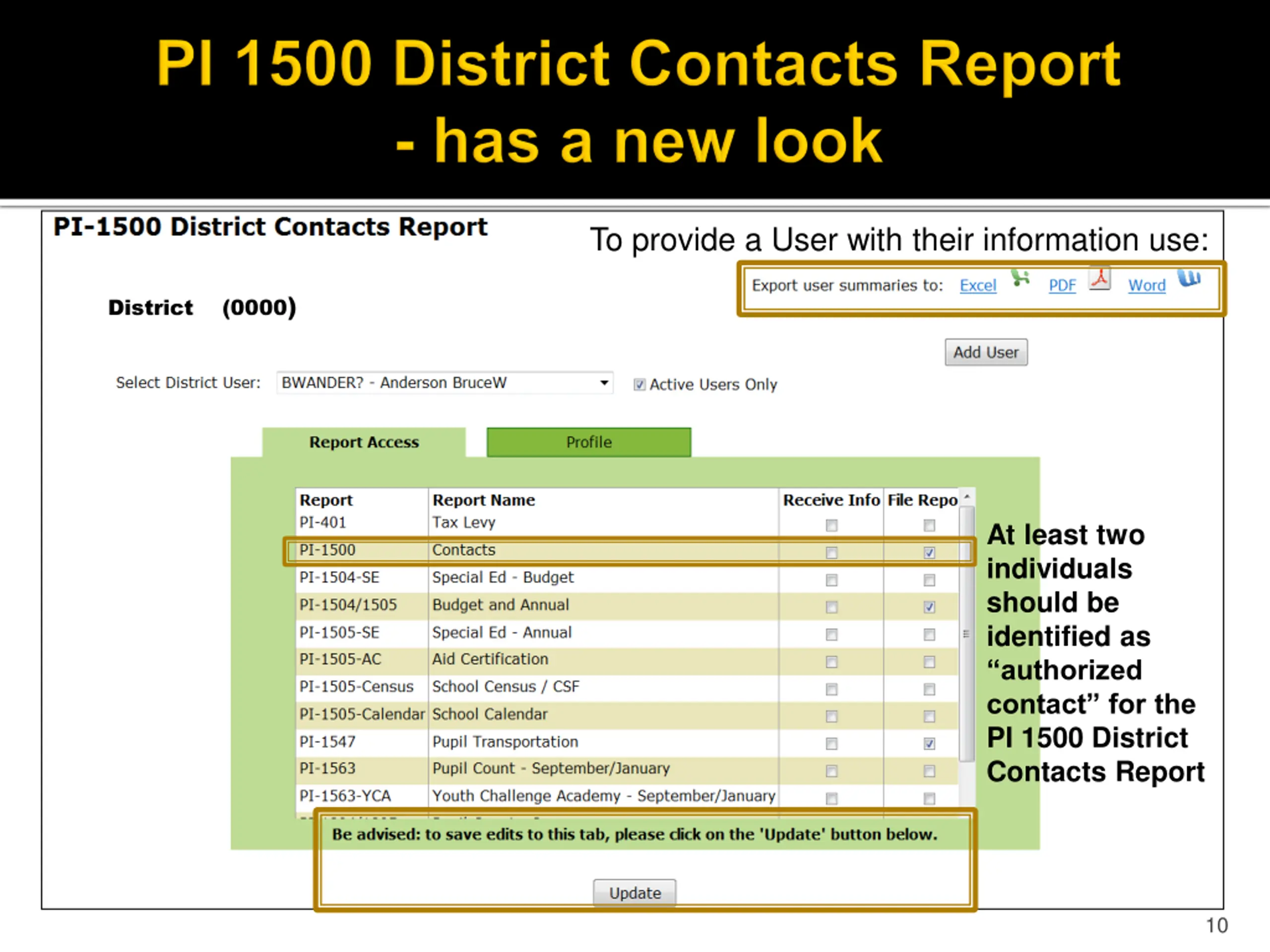 To provide a User with their information use: District (0000) At least two individuals should be identified as authorized contact for the PI 1500 District Contacts Report 10