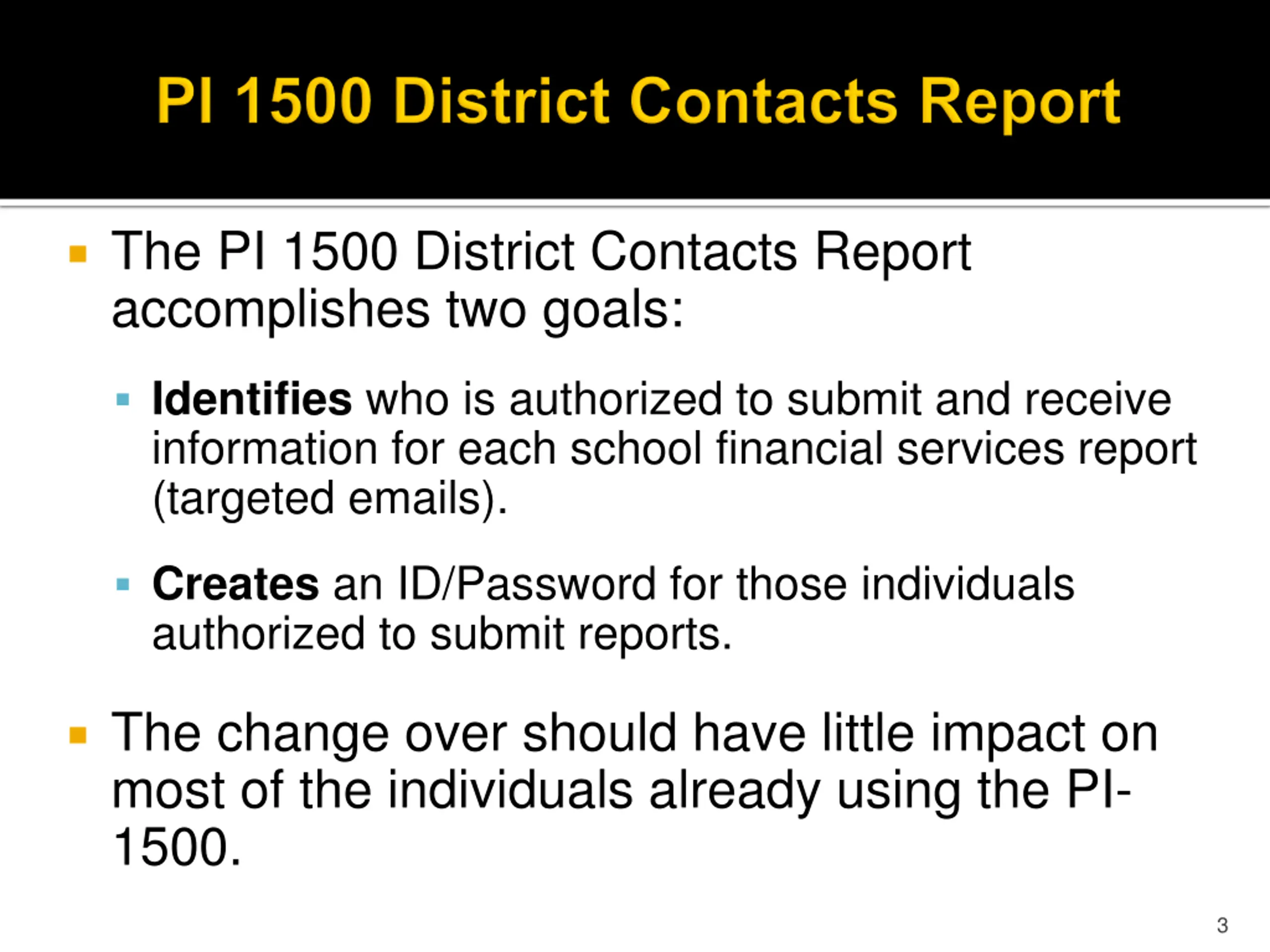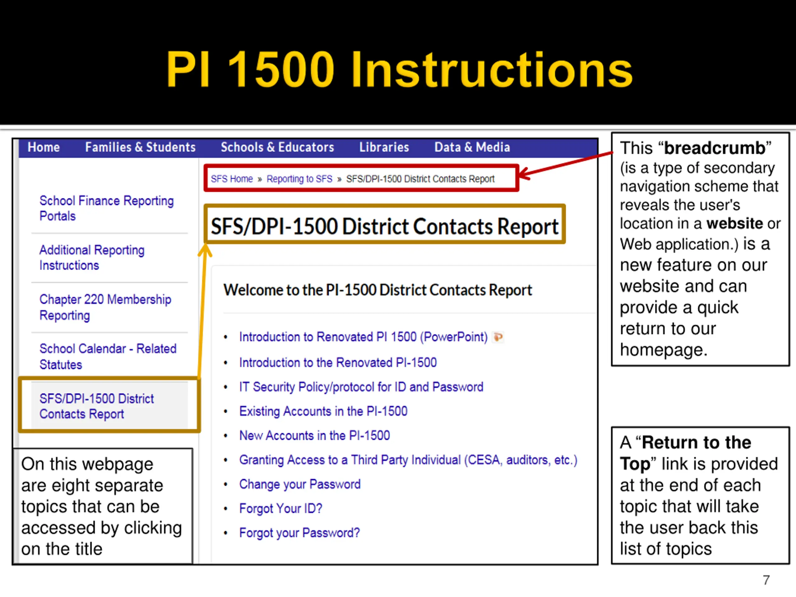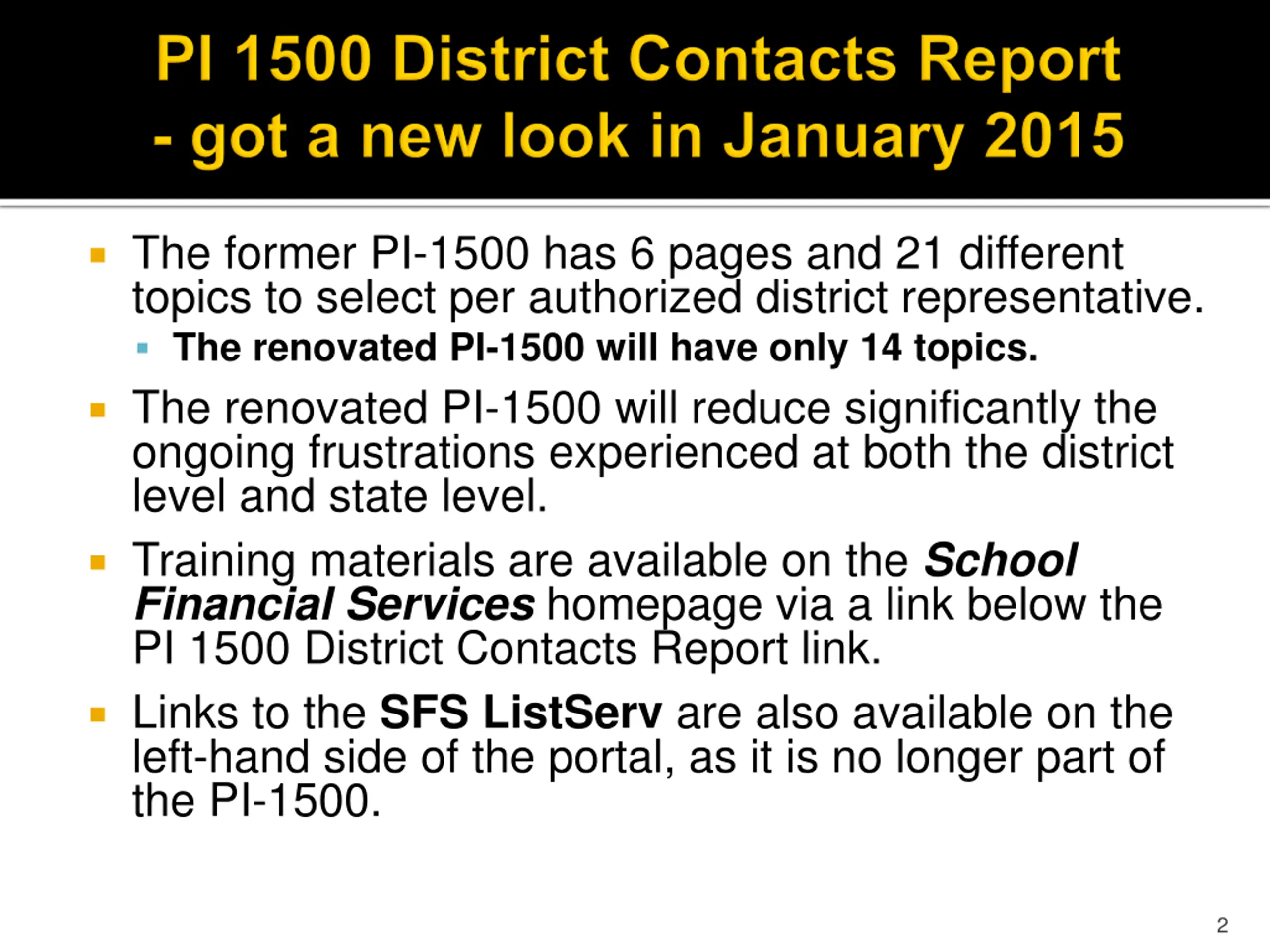 The former PI-1500 has 6 pages and 21 different topics to select per authorized district representative. The renovated PI-1500 will have only 14 topics. The renovated PI-1500 will reduce significantly the ongoing frustrations experienced at both the district level and state level. Training materials are available on the School Financial Services homepage via a link below the PI 1500 District Contacts Report link. Links to the SFS ListServ are also available on the left-hand side of the portal, as it is no longer part of the PI-1500. 2