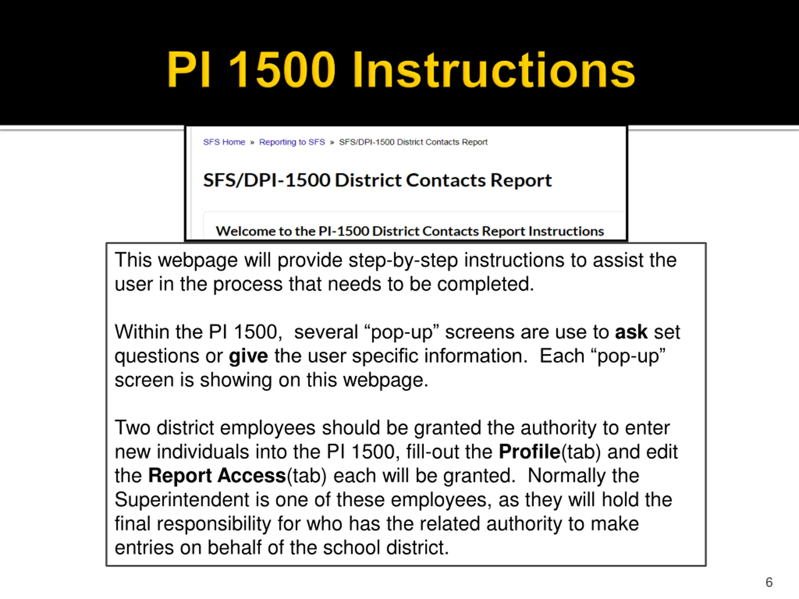 This webpage will provide step-by-step instructions to assist the user in the process that needs to be completed. Within the PI 1500, several pop-up screens are use to ask set questions or givethe user specific information. Each pop-up screen is showing on this webpage. Two district employees should be granted the authority to enter new individuals into the PI 1500, fill-out the Profile(tab) and edit the Report Access(tab) each will be granted. Normally the Superintendent is one of these employees, as they will hold the final responsibility for who has the related authority to make entries on behalf of the school district. 6