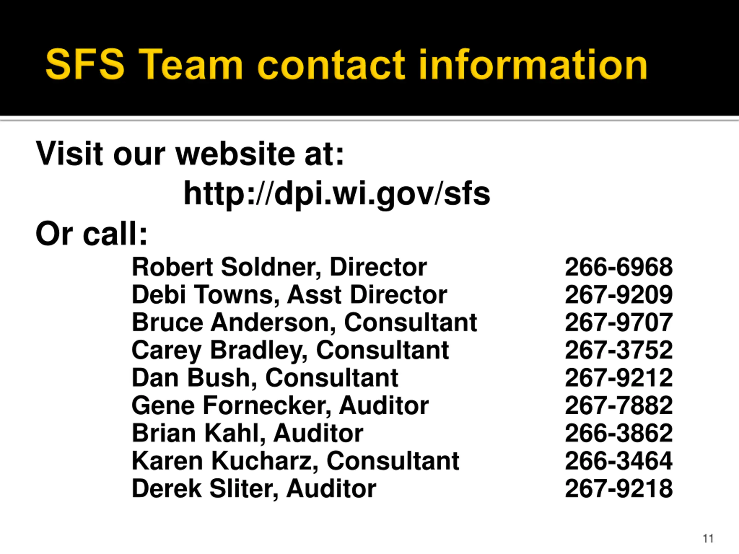 Visit our website at: http://dpi.wi.gov/sfs Or call: Robert Soldner, Director Debi Towns, Asst Director Bruce Anderson, Consultant Carey Bradley, Consultant Dan Bush, Consultant Gene Fornecker, Auditor Brian Kahl, Auditor Karen Kucharz, Consultant Derek Sliter, Auditor 266-6968 267-9209 267-9707 267-3752 267-9212 267-7882 266-3862 266-3464 267-9218 11