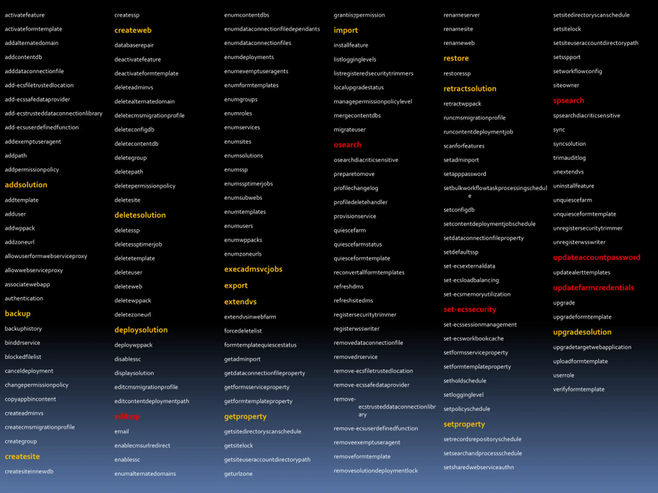 activatefeature createssp enumcontentdbs grantiis7permission renameserver setsitedirectoryscanschedule activateformtemplate enumdataconnectionfiledependants renamesite setsitelock createweb import addalternatedomain enumdataconnectionfiles renameweb setsiteuseraccountdirectorypath databaserepair installfeature addcontentdb enumdeployments setsspport restore deactivatefeature listlogginglevels adddataconnectionfile enumexemptuseragents setworkflowconfig deactivateformtemplate listregisteredsecuritytrimmers restoressp add-ecsfiletrustedlocation enumformtemplates siteowner deleteadminvs localupgradestatus retractsolution add-ecssafedataprovider enumgroups spsearch deletealternatedomain managepermissionpolicylevel retractwppack add-ecstrusteddataconnectionlibrary enumroles deletecmsmigrationprofile mergecontentdbs spsearchdiacriticsensitive runcmsmigrationprofile add-ecsuserdefinedfunction enumservices deleteconfigdb migrateuser sync runcontentdeploymentjob addexemptuseragent enumsites deletecontentdb syncsolution osearch scanforfeatures addpath enumsolutions deletegroup trimauditlog osearchdiacriticsensitive setadminport addpermissionpolicy enumssp deletepath unextendvs preparetomove setapppassword enumssptimerjobs addsolution deletepermissionpolicy uninstallfeature profilechangelog setbulkworkflowtaskprocessingschedul e enumsubwebs addtemplate deletesite unquiescefarm profiledeletehandler setconfigdb enumtemplates adduser unquiesceformtemplate deletesolution provisionservice setcontentdeploymentjobschedule enumusers addwppack unregistersecuritytrimmer deletessp quiescefarm setdataconnectionfileproperty enumwppacks addzoneurl unregisterwsswriter deletessptimerjob quiescefarmstatus setdefaultssp enumzoneurls allowuserformwebserviceproxy updateaccountpassword deletetemplate quiesceformtemplate set-ecsexternaldata execadmsvcjobs allowwebserviceproxy deleteuser reconvertallformtemplates updatealerttemplates set-ecsloadbalancing associatewebapp export deleteweb refreshdms updatefarmcredentials set-ecsmemoryutilization authentication deletewppack refreshsitedms extendvs upgrade set-ecssecurity backup deletezoneurl registersecuritytrimmer extendvsinwebfarm upgradeformtemplate set-ecssessionmanagement backuphistory registerwsswriter deploysolution forcedeletelist upgradesolution set-ecsworkbookcache binddrservice removedataconnectionfile deploywppack formtemplatequiescestatus upgradetargetwebapplication setformsserviceproperty blockedfilelist removedrservice disablessc getadminport uploadformtemplate setformtemplateproperty canceldeployment remove-ecsfiletrustedlocation displaysolution getdataconnectionfileproperty userrole setholdschedule changepermissionpolicy remove-ecssafedataprovider editcmsmigrationprofile getformsserviceproperty verifyformtemplate setlogginglevel copyappbincontent remove- editcontentdeploymentpath getformtemplateproperty ecstrusteddataconnectionlibr ary setpolicyschedule createadminvs editssp getproperty setproperty createcmsmigrationprofile remove-ecsuserdefinedfunction email getsitedirectoryscanschedule setrecordsrepositoryschedule creategroup removeexemptuseragent enablecmsurlredirect getsitelock setsearchandprocessschedule createsite removeformtemplate enablessc getsiteuseraccountdirectorypath setsharedwebserviceauthn removesolutiondeploymentlock createsiteinnewdb enumalternatedomains geturlzone