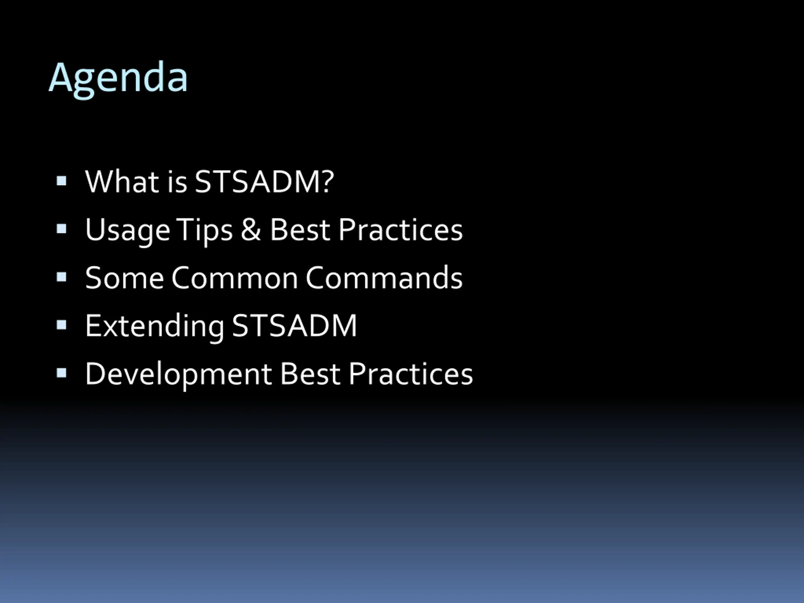 Agenda What is STSADM? Usage Tips & Best Practices Some Common Commands Extending STSADM Development Best Practices