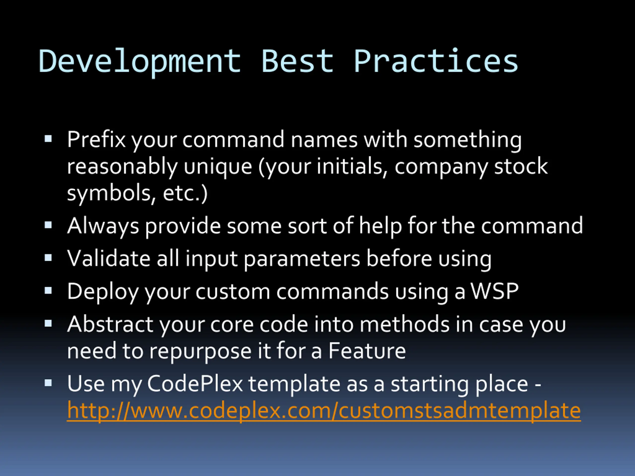 Development Best Practices Prefix your command names with something reasonably unique (your initials, company stock symbols, etc.) Always provide some sort of help for the command Validate all input parameters before using Deploy your custom commands using a WSP Abstract your core code into methods in case you need to repurpose it for a Feature Use my CodePlex template as a starting place - http://www.codeplex.com/customstsadmtemplate