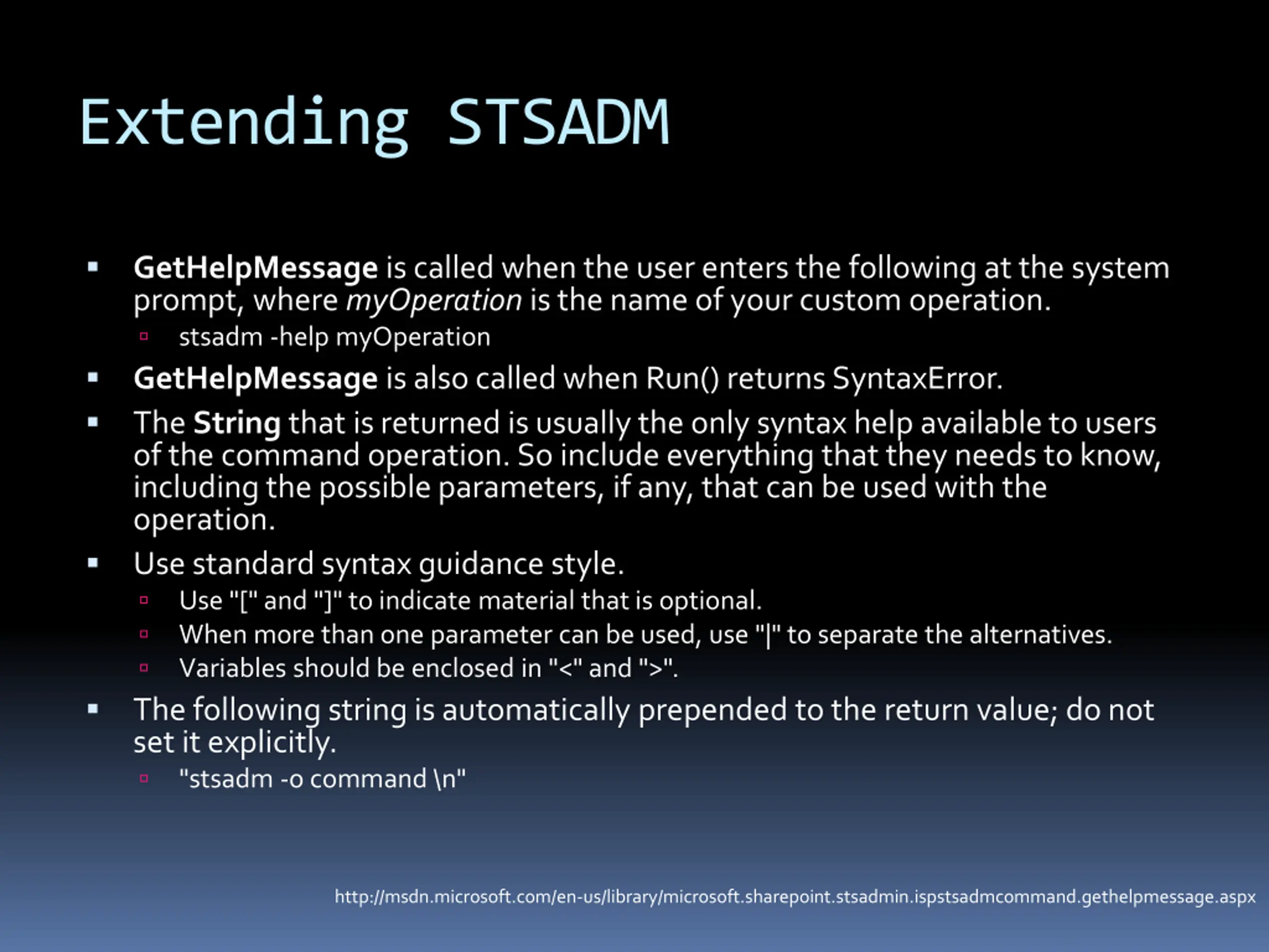Extending STSADM GetHelpMessage is called when the user enters the following at the system prompt, where myOperation is the name of your custom operation. stsadm -help myOperation GetHelpMessage is also called when Run() returns SyntaxError. The String that is returned is usually the only syntax help available to users of the command operation. So include everything that they needs to know, including the possible parameters, if any, that can be used with the operation. Use standard syntax guidance style. Use "[" and "]" to indicate material that is optional. When more than one parameter can be used, use "|" to separate the alternatives. Variables should be enclosed in "<" and ">". The following string is automatically prepended to the return value; do not set it explicitly. "stsadm -o command \n" http://msdn.microsoft.com/en-us/library/microsoft.sharepoint.stsadmin.ispstsadmcommand.gethelpmessage.aspx