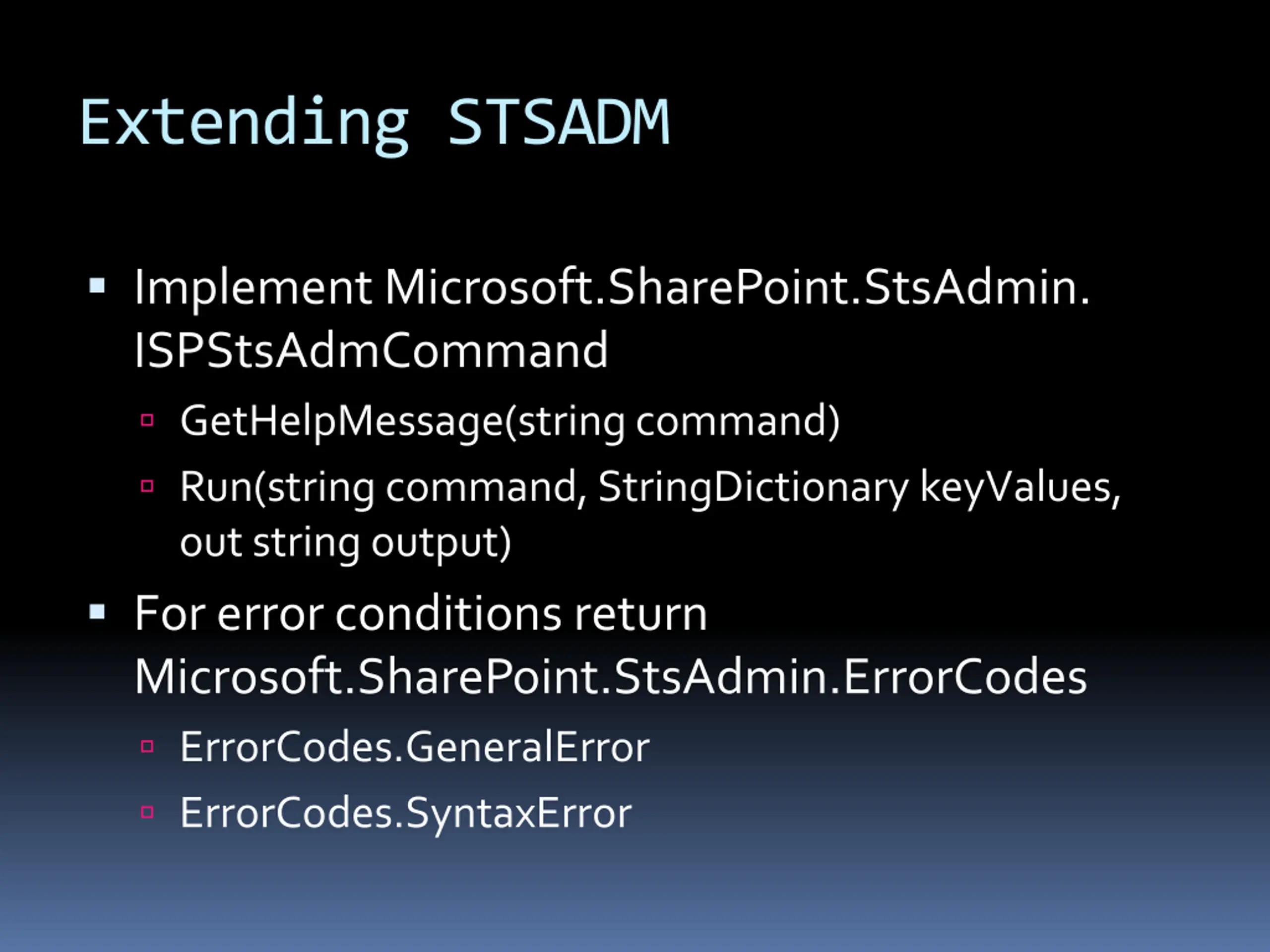 Extending STSADM Implement Microsoft.SharePoint.StsAdmin. ISPStsAdmCommand GetHelpMessage(string command) Run(string command, StringDictionary keyValues, out string output) For error conditions return Microsoft.SharePoint.StsAdmin.ErrorCodes ErrorCodes.GeneralError ErrorCodes.SyntaxError