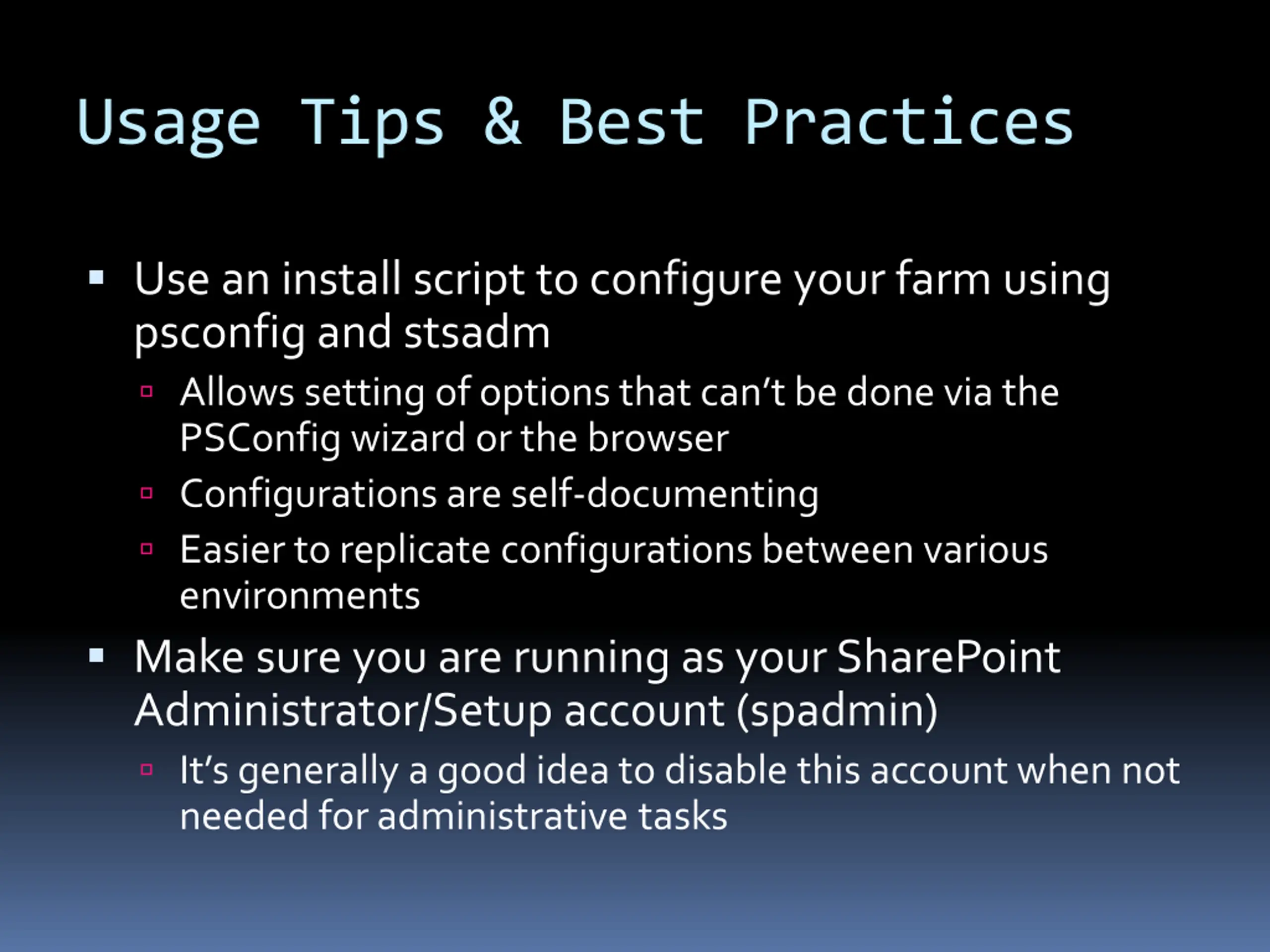 Usage Tips & Best Practices Use an install script to configure your farm using psconfig and stsadm Allows setting of options that can t be done via the PSConfigwizard or the browser Configurations are self-documenting Easier to replicate configurations between various environments Make sure you are running as your SharePoint Administrator/Setup account (spadmin) It s generally a good idea to disable this account when not needed for administrative tasks