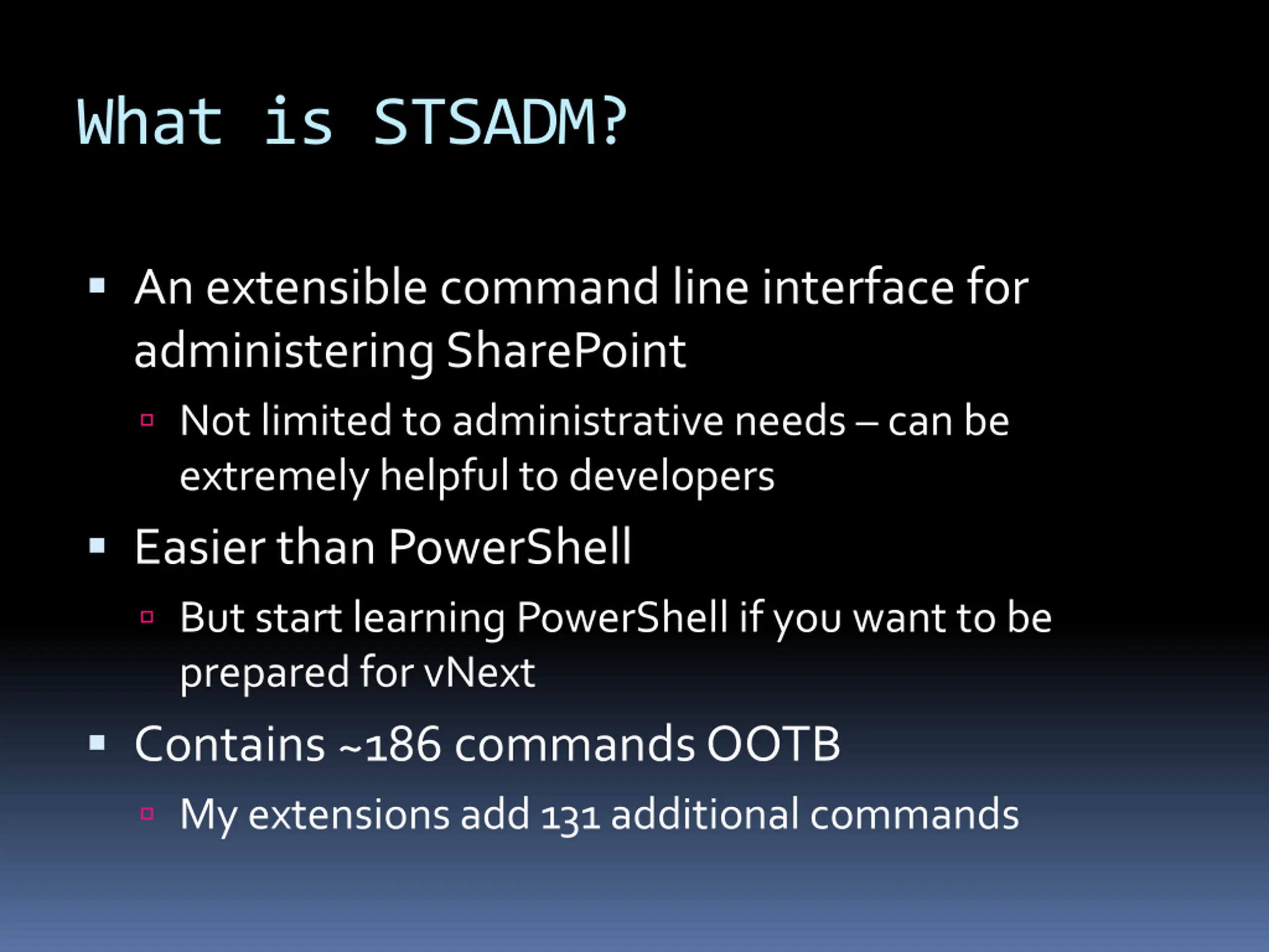 What is STSADM? An extensible command line interface for administering SharePoint Not limited to administrative needs can be extremely helpful to developers Easier than PowerShell But start learning PowerShellif you want to be prepared for vNext Contains ~186 commands OOTB My extensions add 131 additional commands