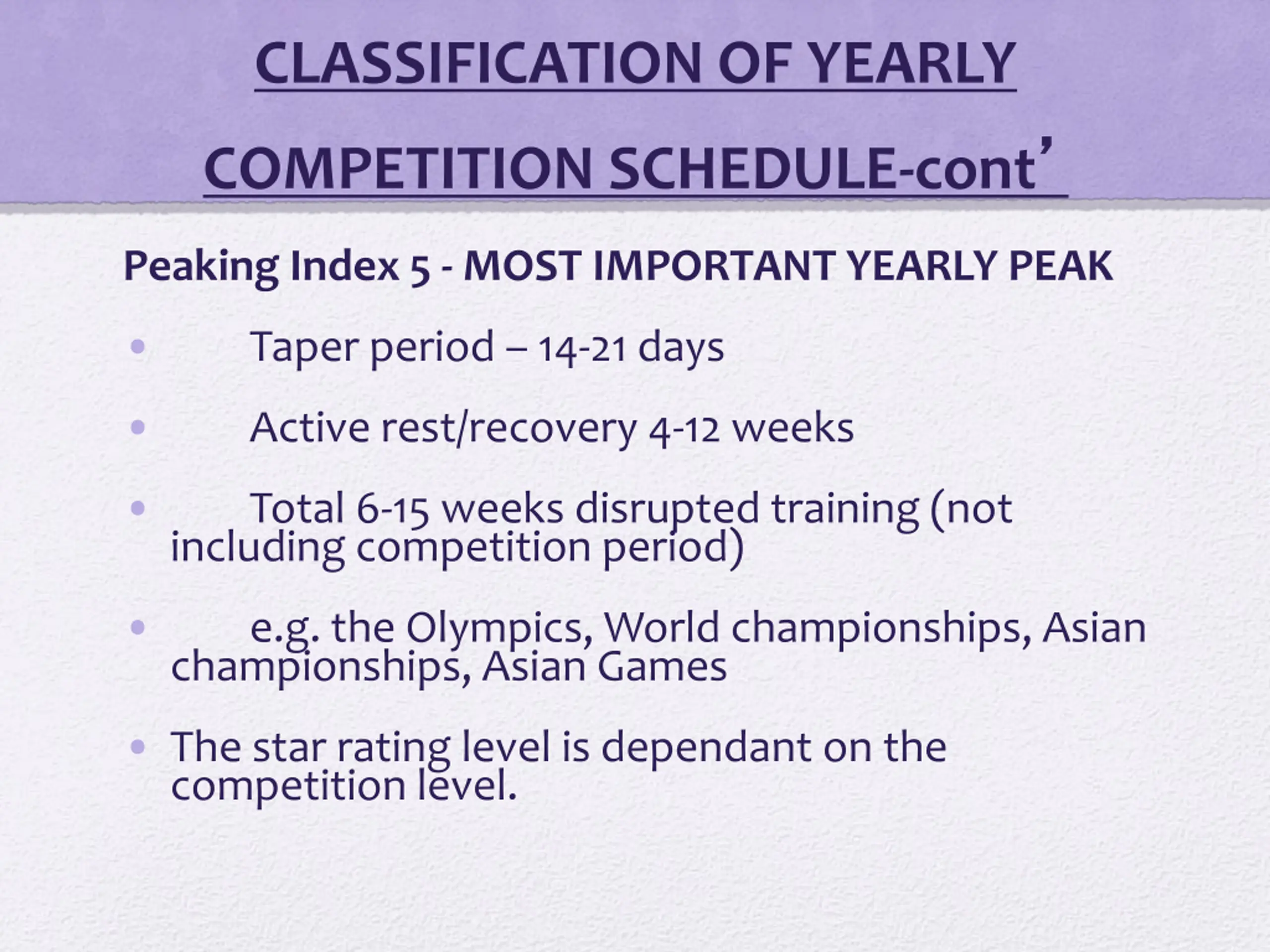 CLASSIFICATION OF YEARLY COMPETITION SCHEDULE-cont Peaking Index 5 - MOST IMPORTANT YEARLY PEAK Taper period 14-21 days Active rest/recovery 4-12 weeks Total 6-15 weeks disrupted training (not including competition period) e.g. the Olympics, World championships, Asian championships, Asian Games The star rating level is dependant on the competition level.