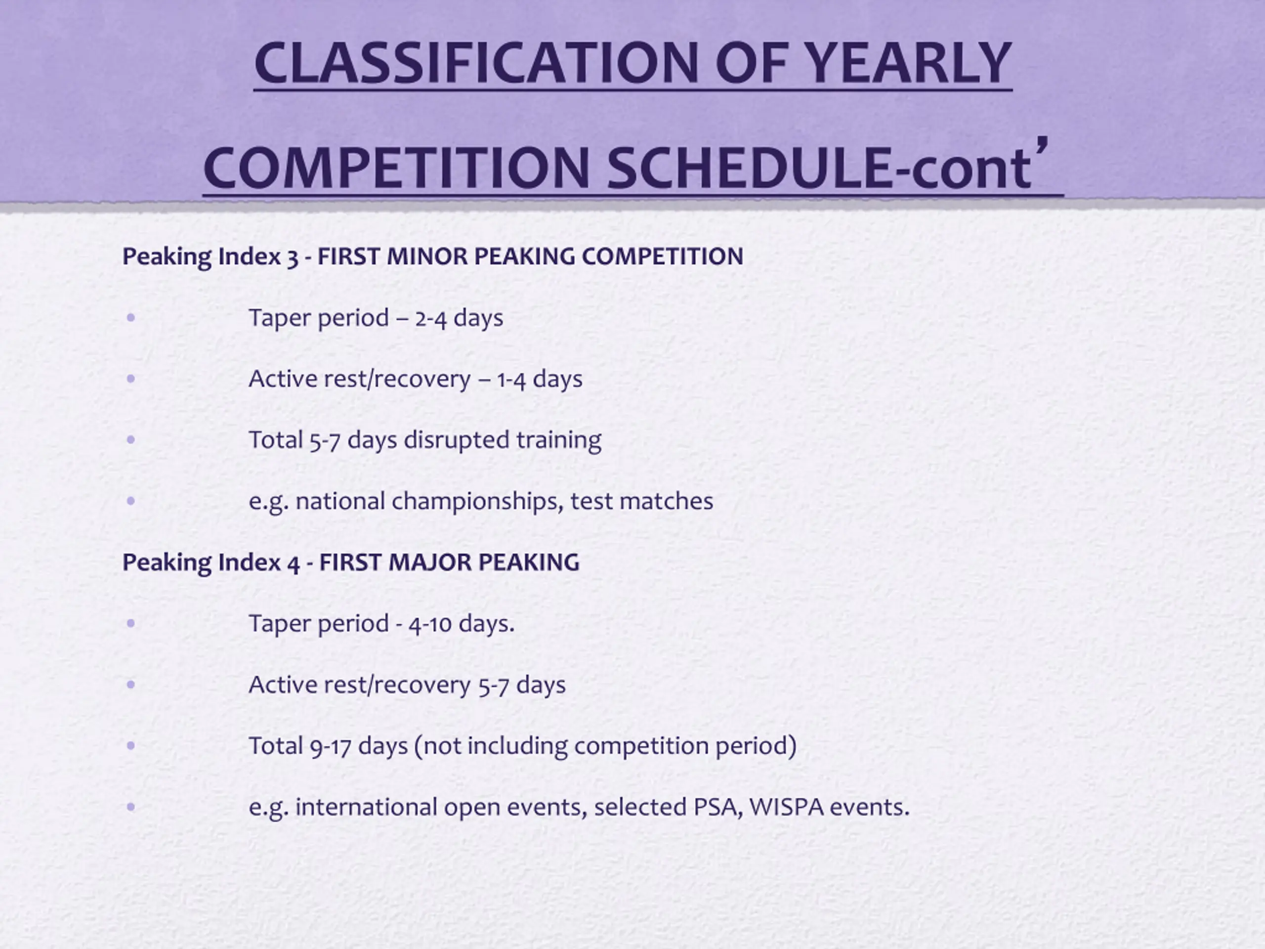 CLASSIFICATION OF YEARLY COMPETITION SCHEDULE-cont Peaking Index 3 -FIRST MINOR PEAKING COMPETITION Taper period 2-4 days Active rest/recovery 1-4 days Total 5-7 days disrupted training e.g. national championships, test matches Peaking Index 4 - FIRST MAJOR PEAKING Taper period - 4-10 days. Active rest/recovery 5-7 days Total 9-17 days (not including competition period) e.g. international open events, selected PSA, WISPA events.