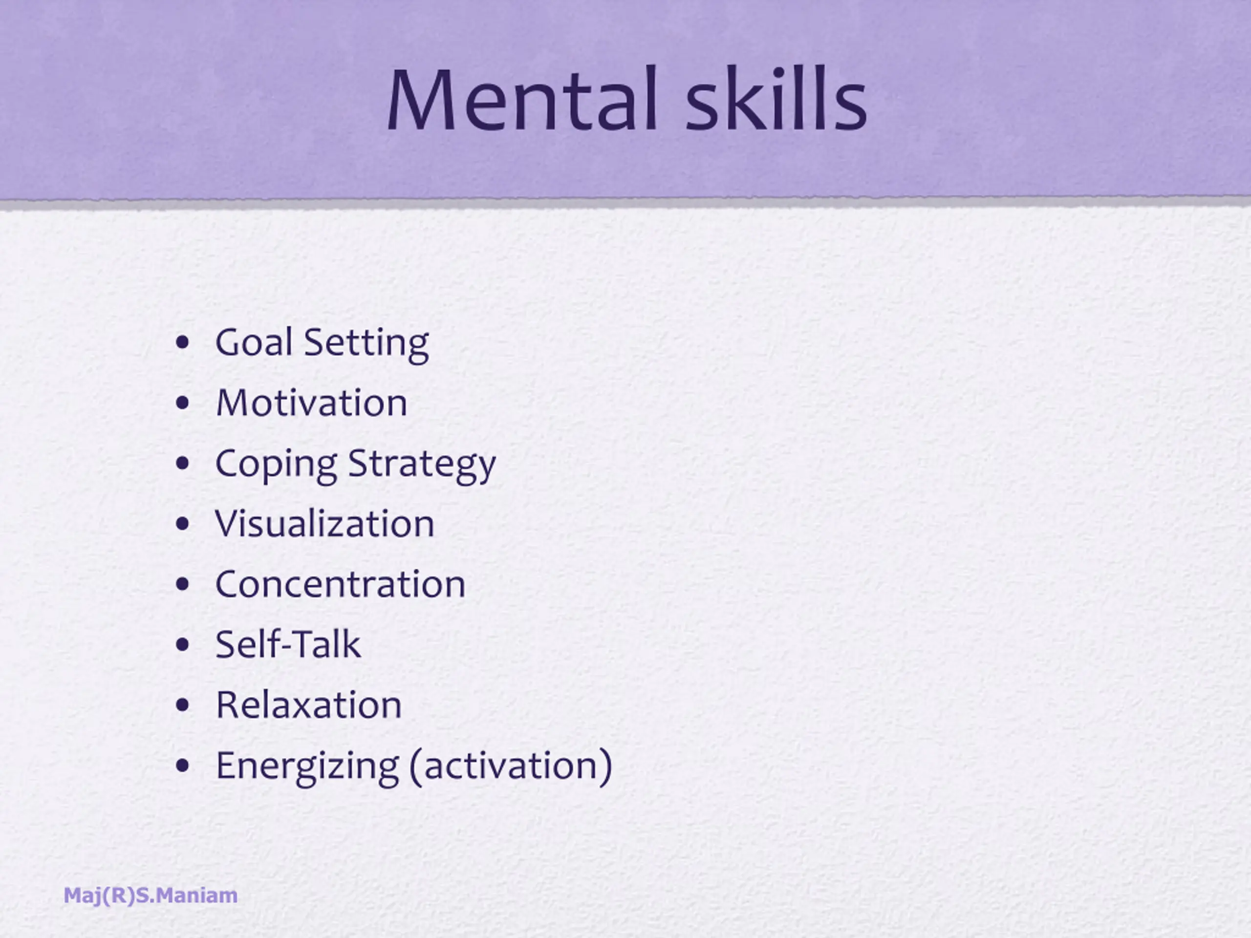 Mental skills Goal Setting Motivation Coping Strategy Visualization Concentration Self-Talk Relaxation Energizing (activation) Maj(R)S.Maniam