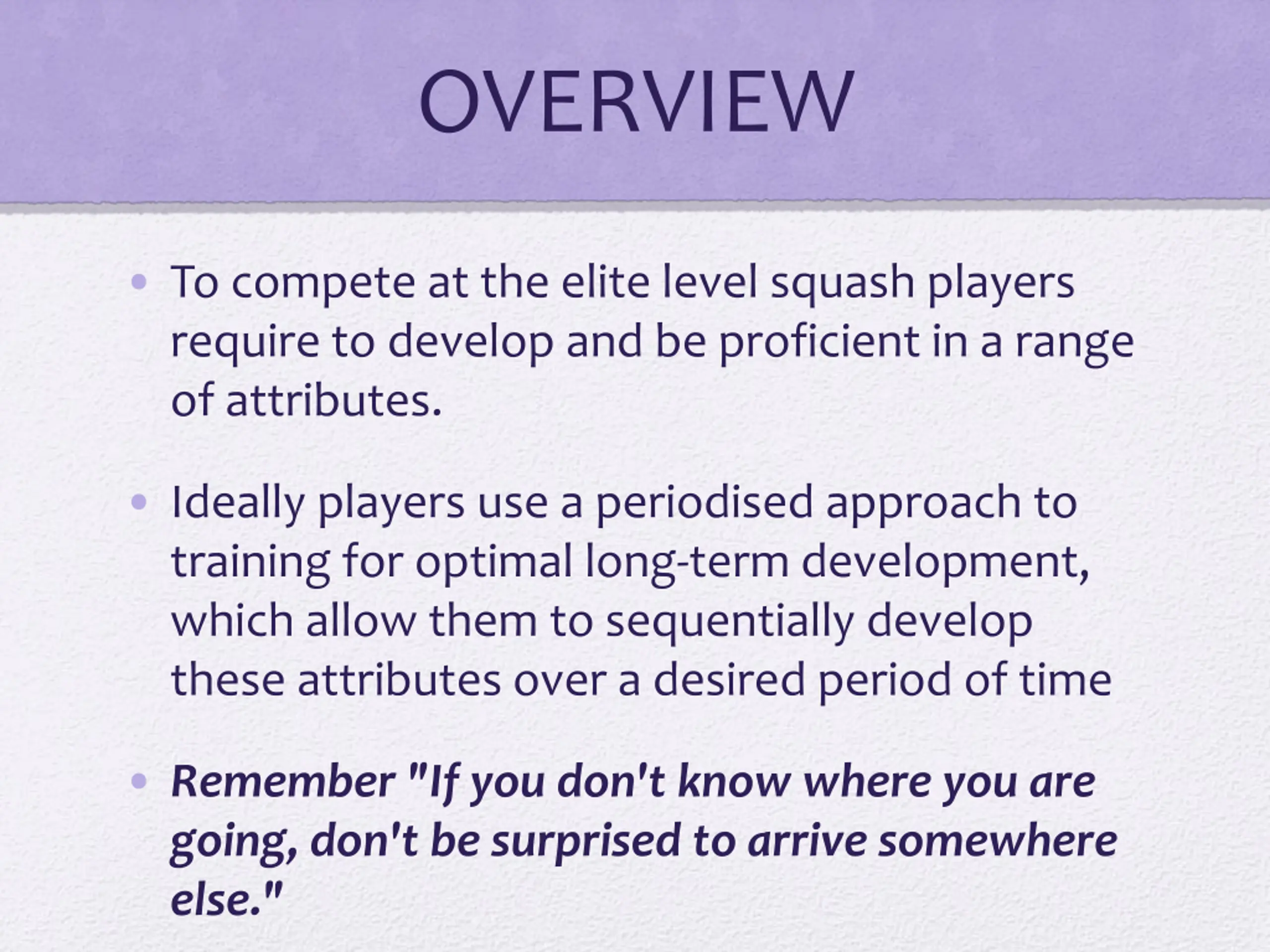 OVERVIEW To compete at the elite level squash players require to develop and be proficient in a range of attributes. Ideally players use a periodised approach to training for optimal long-term development, which allow them to sequentially develop these attributes over a desired period of time Remember "If you don't know where you are going, don't be surprised to arrive somewhere else."
