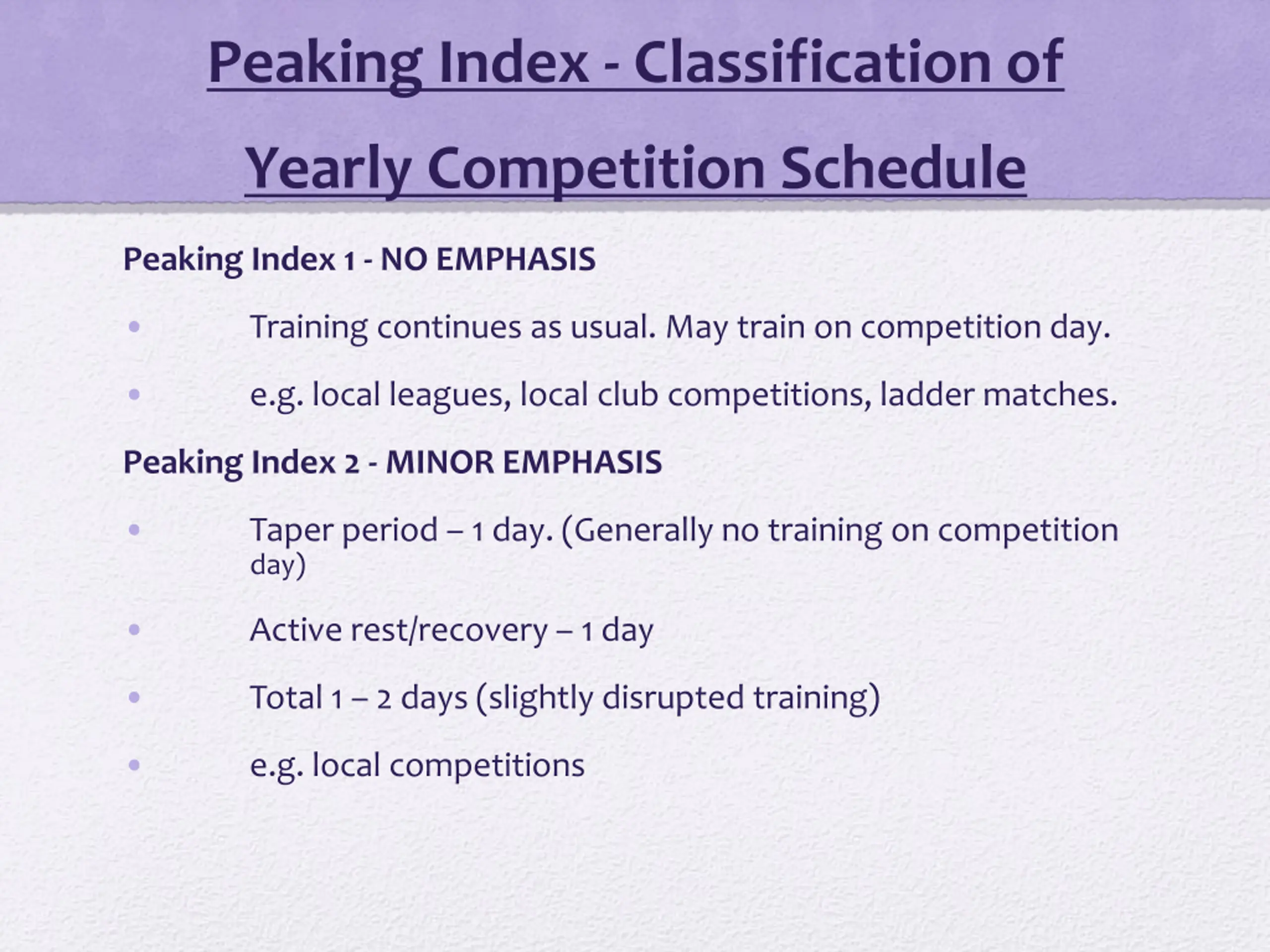 Peaking Index - Classification of Yearly Competition Schedule Peaking Index 1 - NO EMPHASIS Training continues as usual. May train on competition day. e.g. local leagues, local club competitions, ladder matches. Peaking Index 2 - MINOR EMPHASIS Taper period 1 day. (Generally no training on competition day) Active rest/recovery 1 day Total 1 2 days (slightly disrupted training) e.g. local competitions