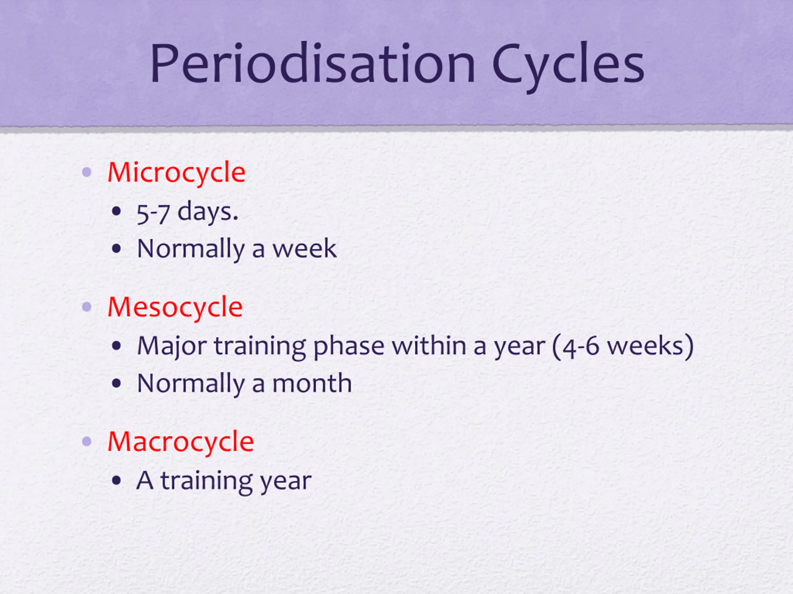 Periodisation Cycles Microcycle 5-7 days. Normally a week Mesocycle Major training phase within a year (4-6 weeks) Normally a month Macrocycle A training year