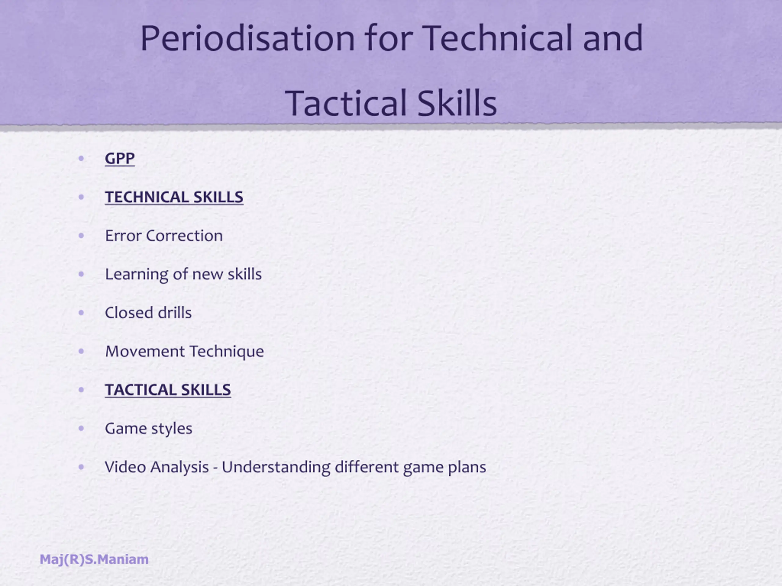 Periodisation for Technical and Tactical Skills GPP TECHNICAL SKILLS Error Correction Learning of new skills Closed drills Movement Technique TACTICAL SKILLS Game styles Video Analysis - Understanding different game plans Maj(R)S.Maniam
