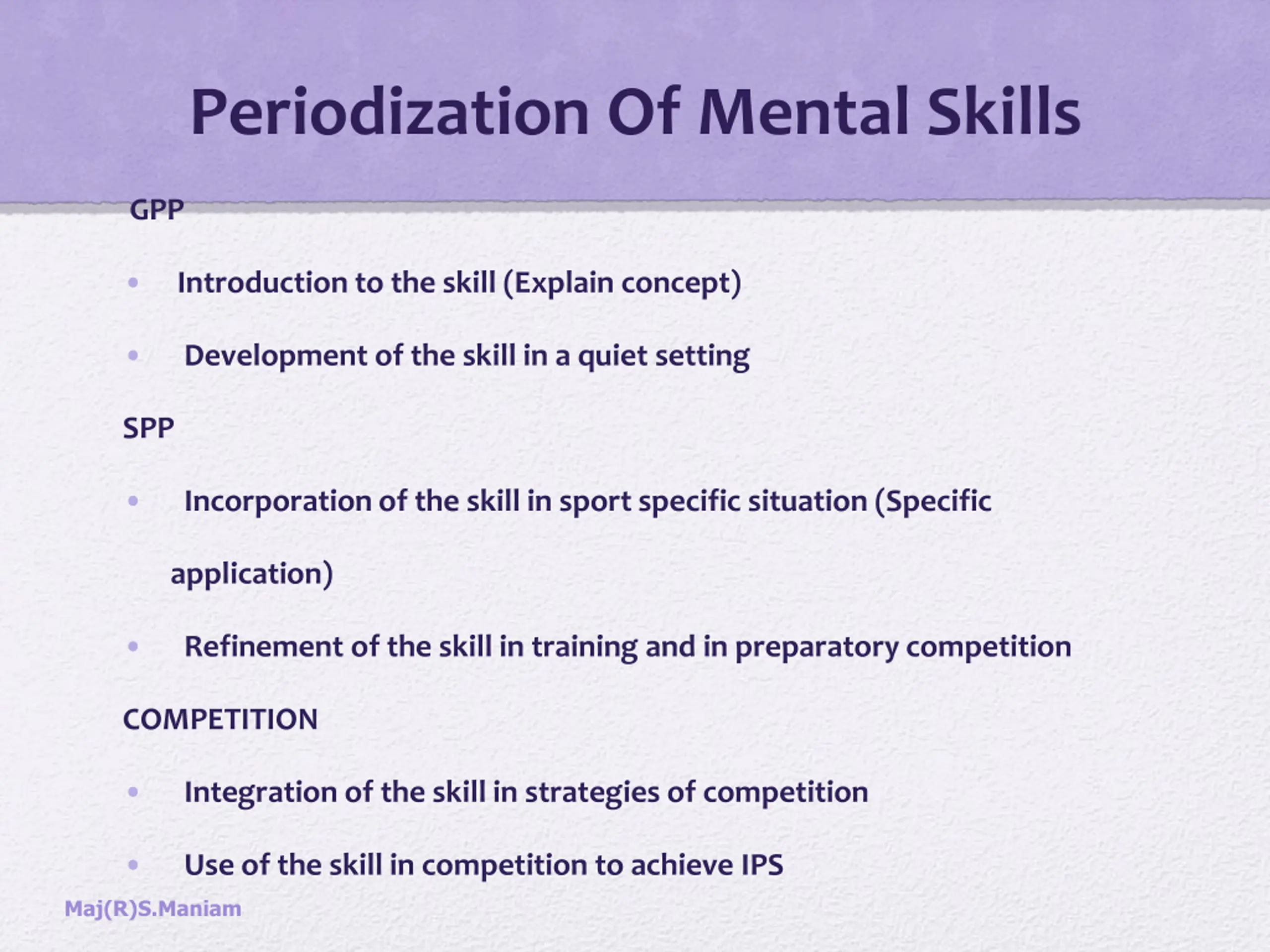 Periodization Of Mental Skills GPP Introduction to the skill (Explain concept) Development of the skill in a quiet setting SPP Incorporation of the skill in sport specific situation (Specific application) Refinement of the skill in training and in preparatory competition COMPETITION Integration of the skill in strategies of competition Use of the skill in competition to achieve IPS Maj(R)S.Maniam