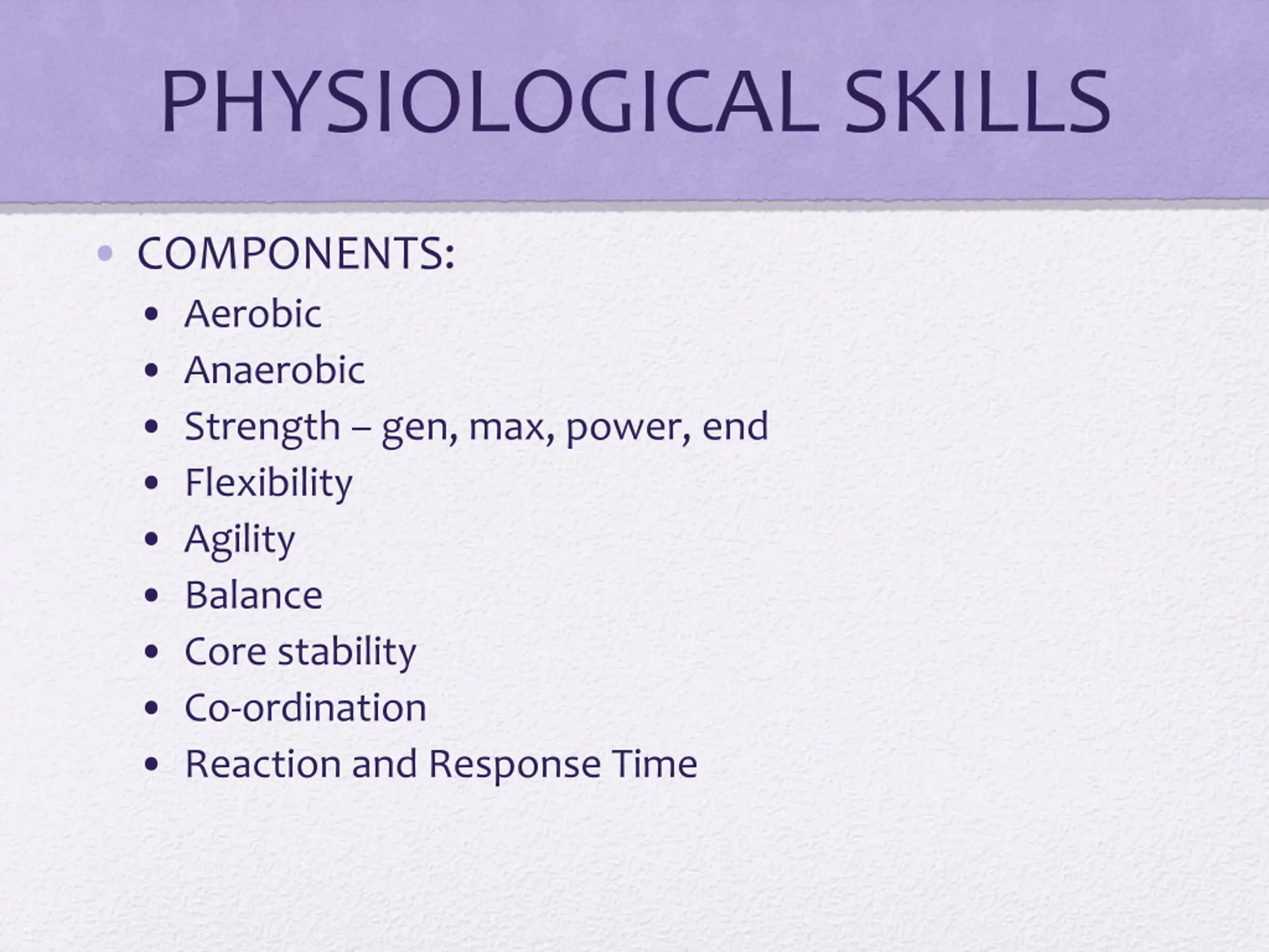 PHYSIOLOGICAL SKILLS COMPONENTS: Aerobic Anaerobic Strength gen, max, power, end Flexibility Agility Balance Core stability Co-ordination Reaction and Response Time