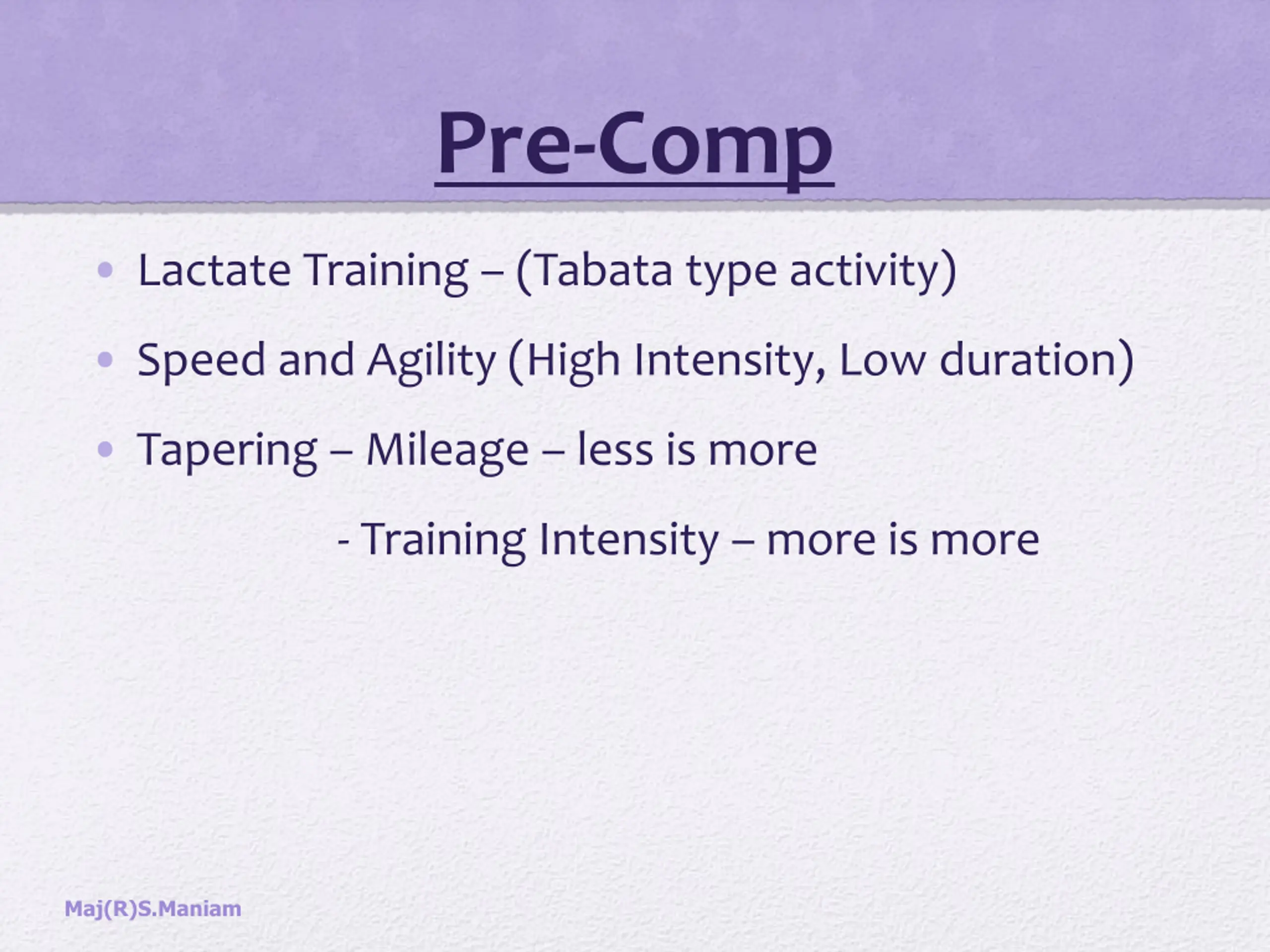Pre-Comp Lactate Training (Tabata type activity) Speed and Agility (High Intensity, Low duration) Tapering Mileage less is more - Training Intensity more is more Maj(R)S.Maniam